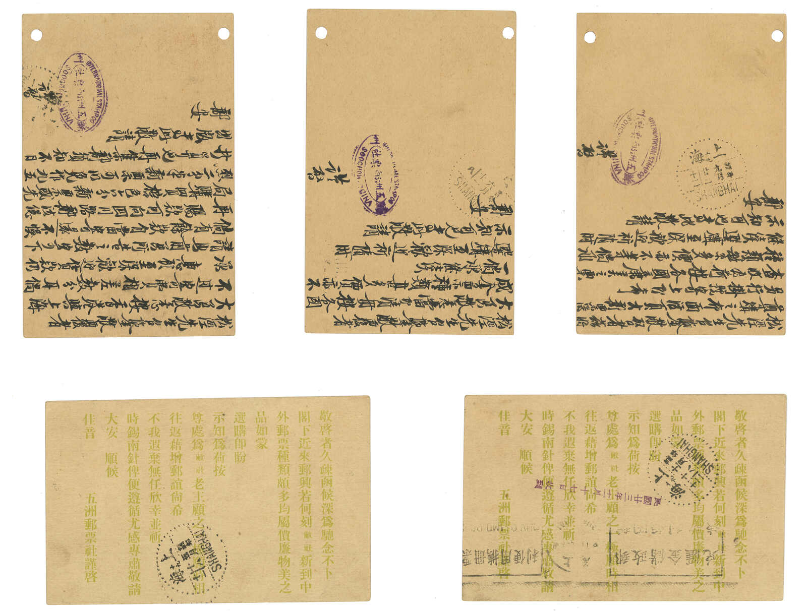 1930年代一組八張帆船第七版1分郵資片,由蘇州五洲郵票社寄香港或上海,加貼帆船半分或1分。內容均與集郵相關。(Image 1)