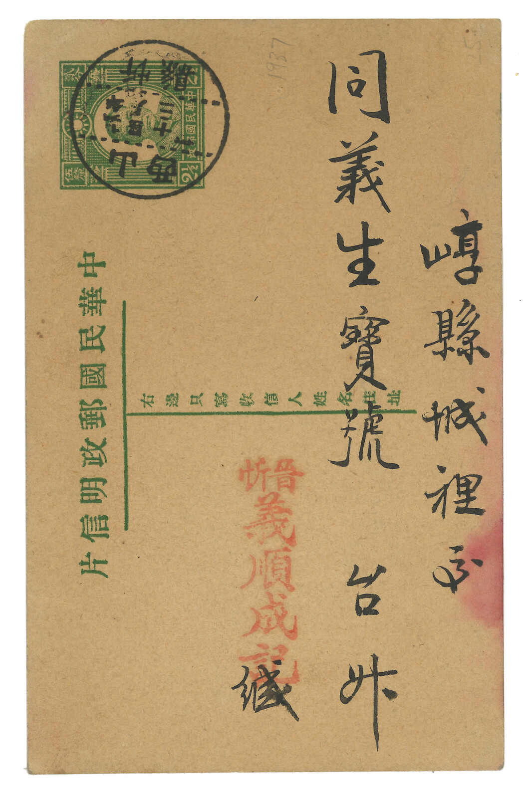 1931至1932年一組五件帆船第七版1分及2分郵資片(韓目32-33),包含新版及實寄片。當中1分片包含兩款“國”字版式。一件1932年12月8日寄出2分片加貼北京一版農穫圖1角3分,為晚期貼用例子。(Image