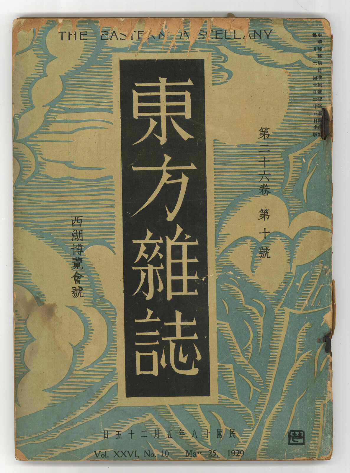 1929.5.25 《東方雜誌第二十六卷第十號 / 西湖博覽會號》,封面封底部分分離。(Image 1)