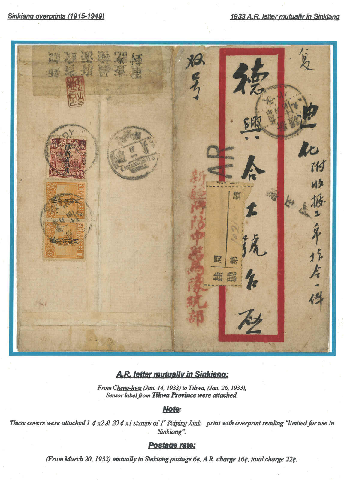 1933 Chenghwa (14 Jan) to TIhwa. Double-registered cover, f.w. Junk ovpt. Limited For Use in Sinkiang 1c in pair + 20c on reverse, in total of 22c double-reigstered rate, tied by Sinkiang Chenghwa cds, alongside with registered