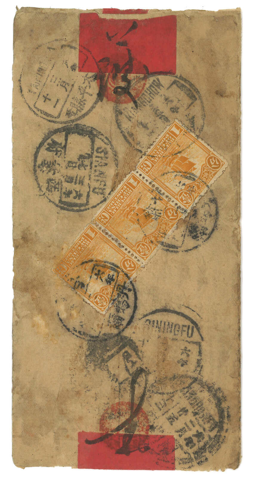 1917 Tanghar (Feb) to Taiping. Red band cover, f.w. Junk 3c in strip of 3, tied by Kansu Tanghar cds. Transit Siningfu (19 Feb), Lanchow (25 Feb), Sian (7 Mar). Arrived Taipinghsien (11 Mar). Early mails from small towns in