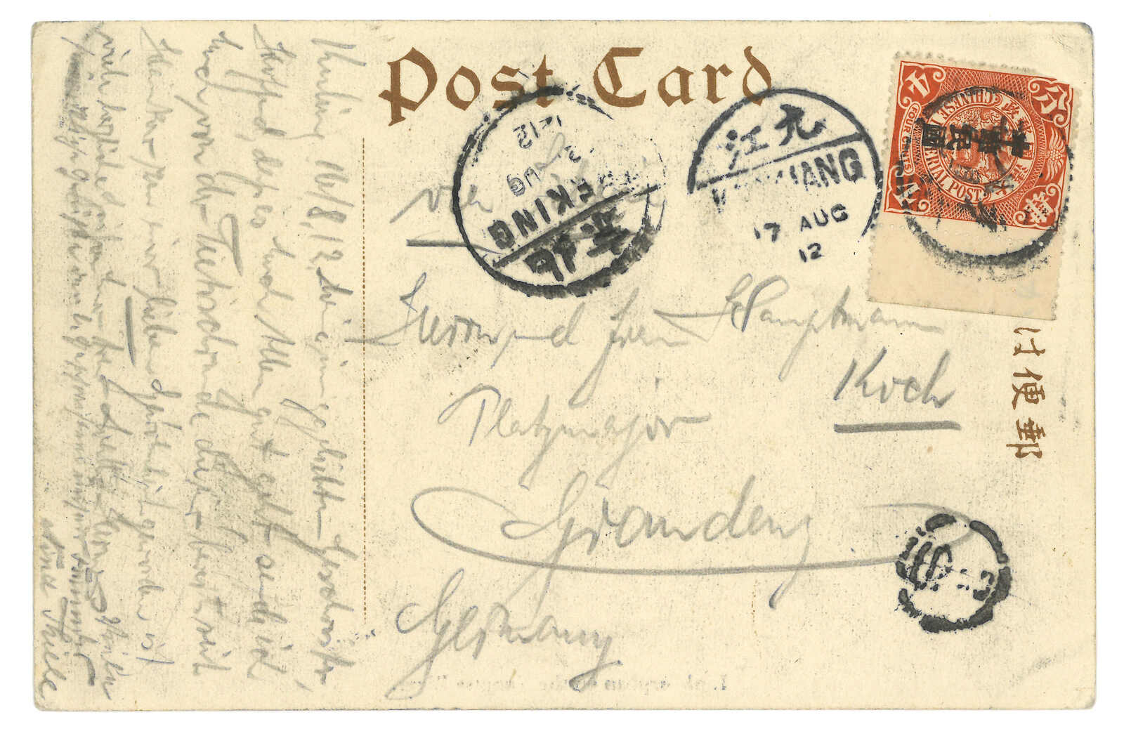 1912 Little Orphan on Yangtse River PPC from Kuling, f.w. Coiling Dragon ovpt. ROC 4c. Transit Kiukiang (17 Aug), Peking (22 Aug).