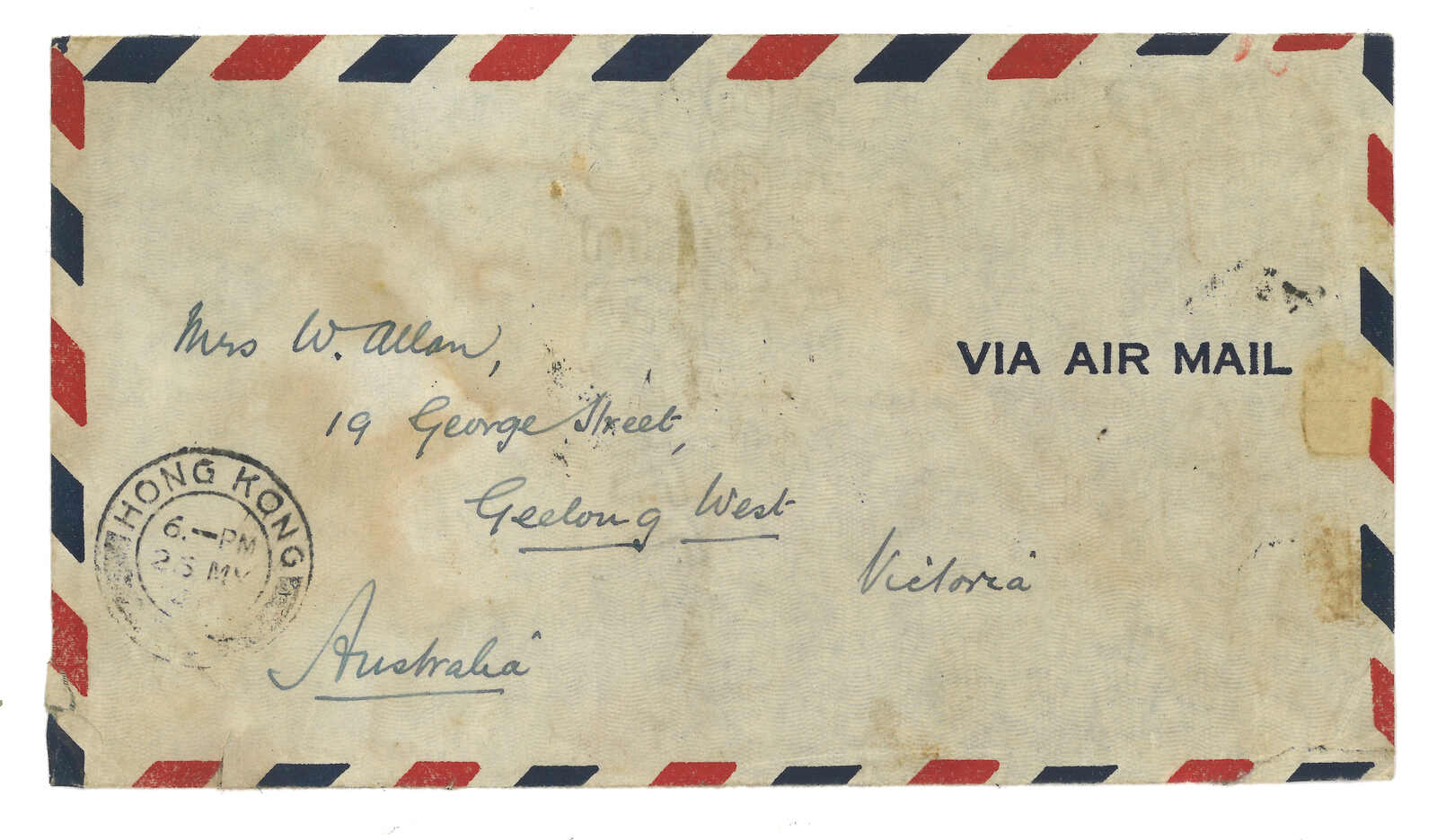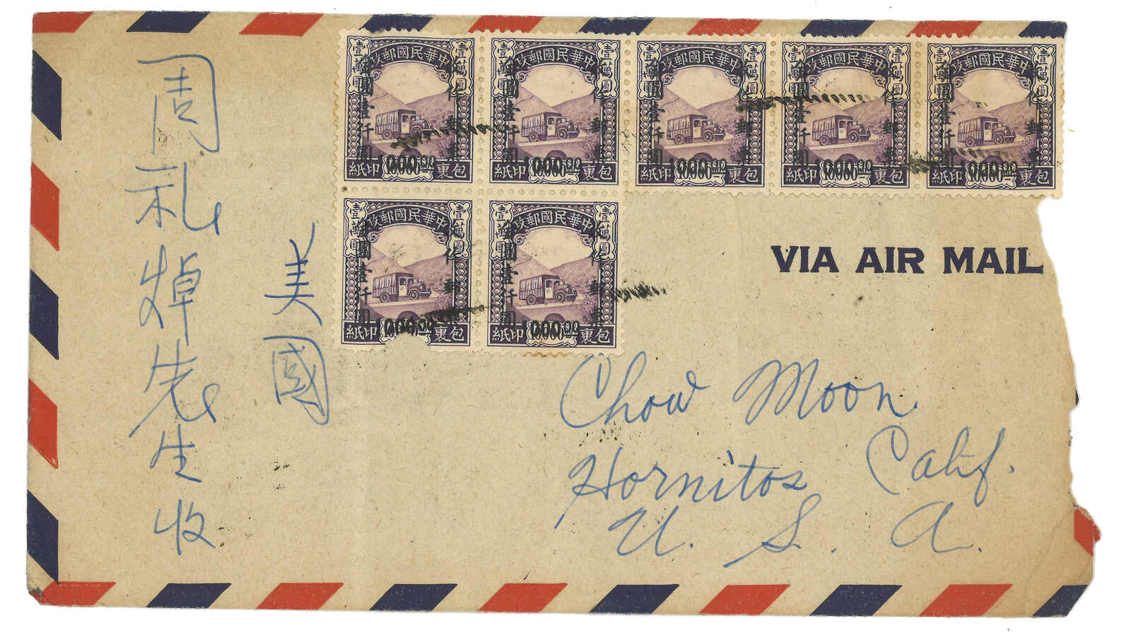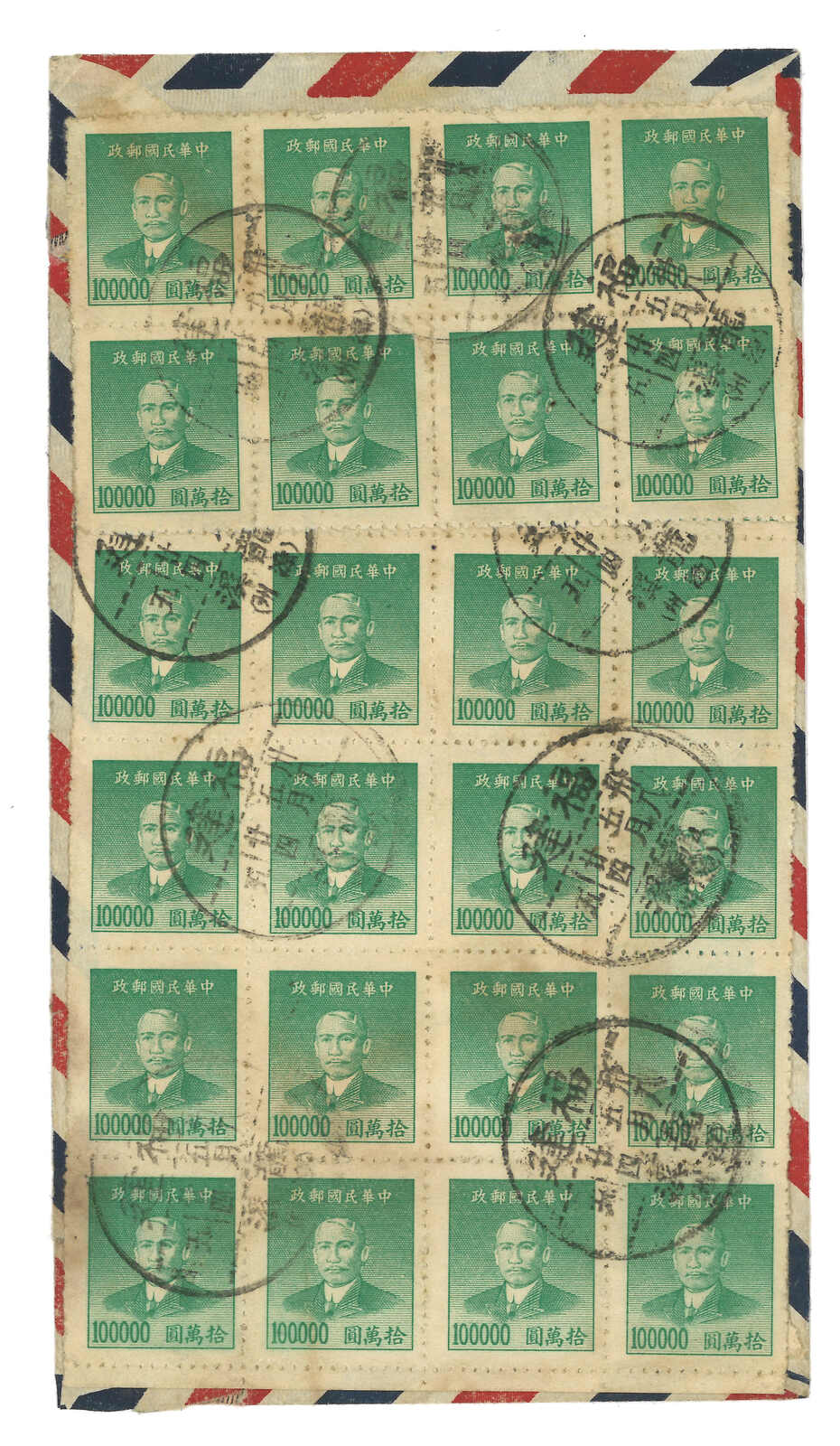 1949.5.24 龍溪寄澳州,背貼孫像金圓10萬元二十四方連,合240萬元,銷福建龍溪三格日戳。5.26經香港。銀圓時期貼用金圓票例子,適合郵資研究。(Image 1)