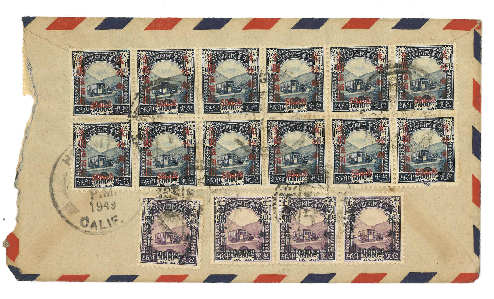 1949 a pair of covers to USA f.w. large multiple of Gold Yuan issues. One f.w. parcel stamps surch Gold Yuan x23, in total of $17000, tied by edge of postmark. Another f.w. Revenue stamp surch Gold Yuan + SYS Gold Yuan x21, in