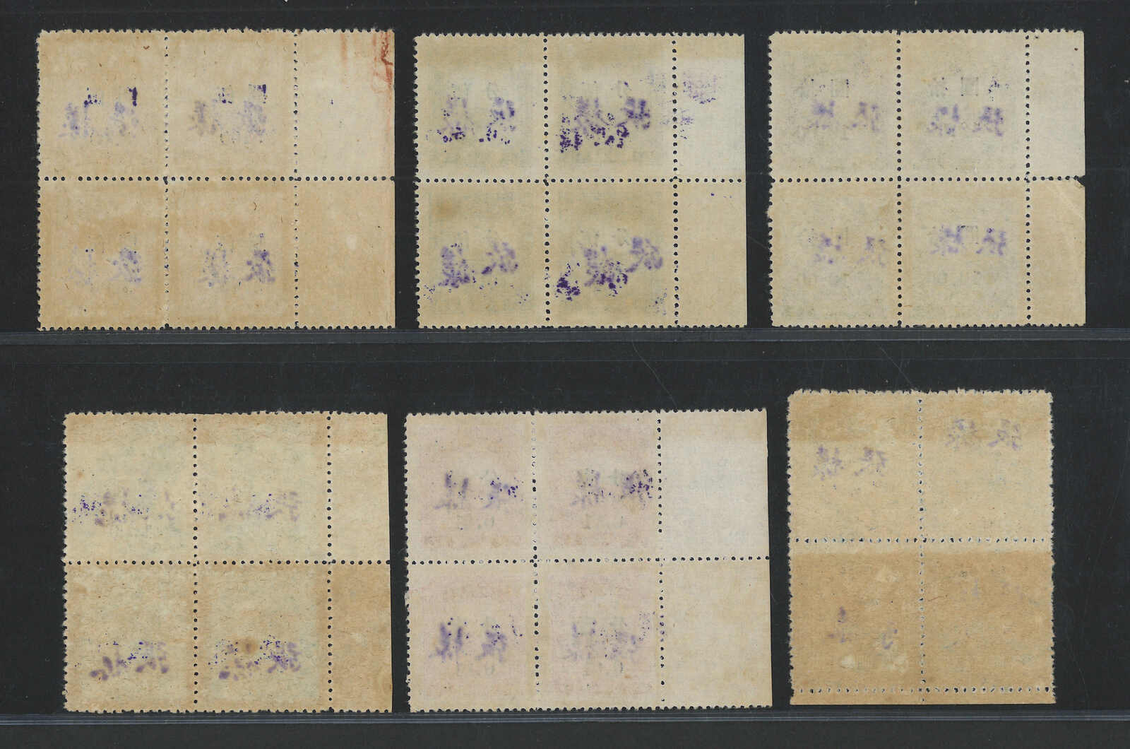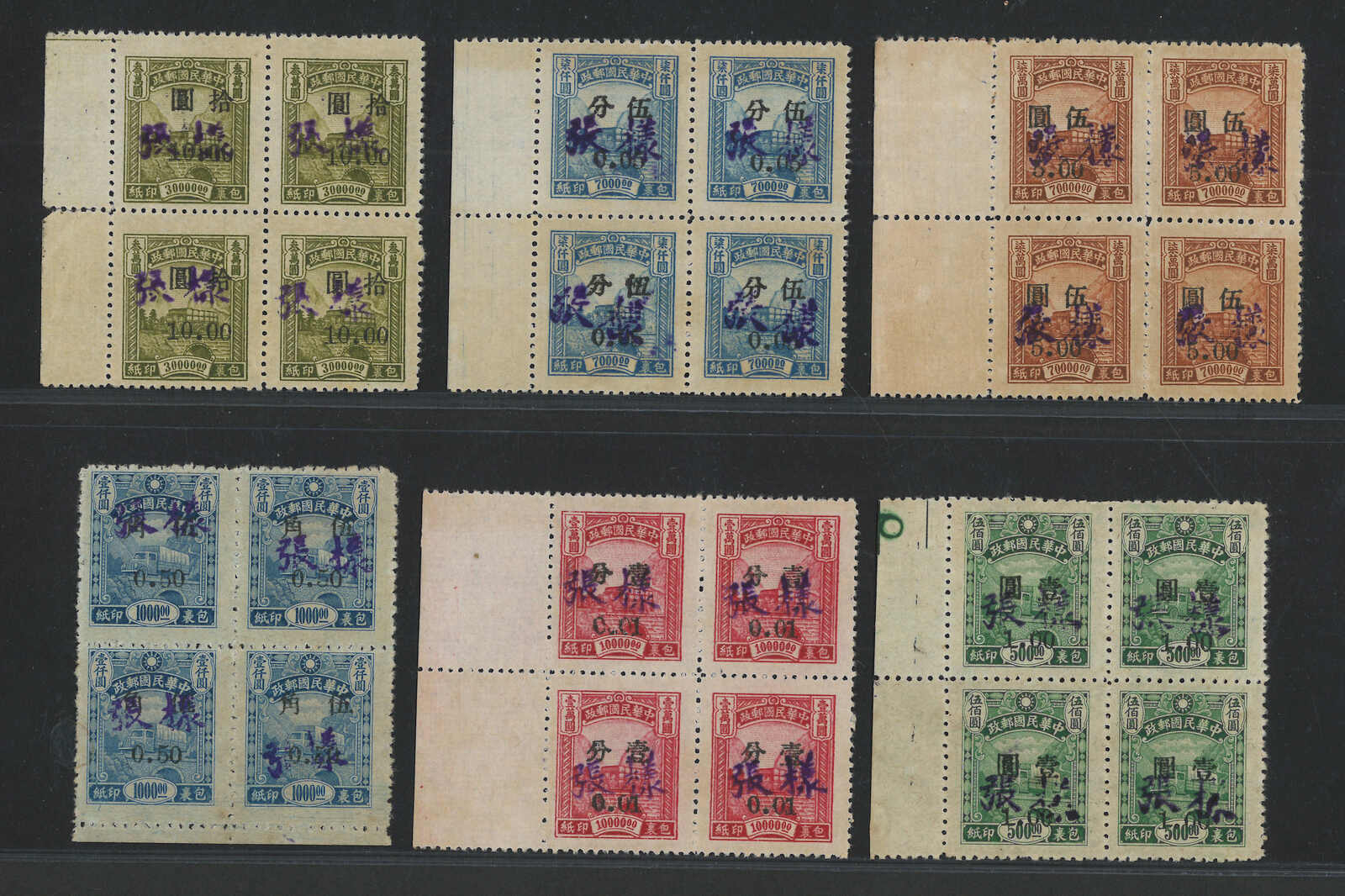 1949 Huan surch Silver Yuan on parcel stamp specimen complete set in block of 4 with margin (Chan SP1-7), MNH. A rarity of Silver Yuan.
