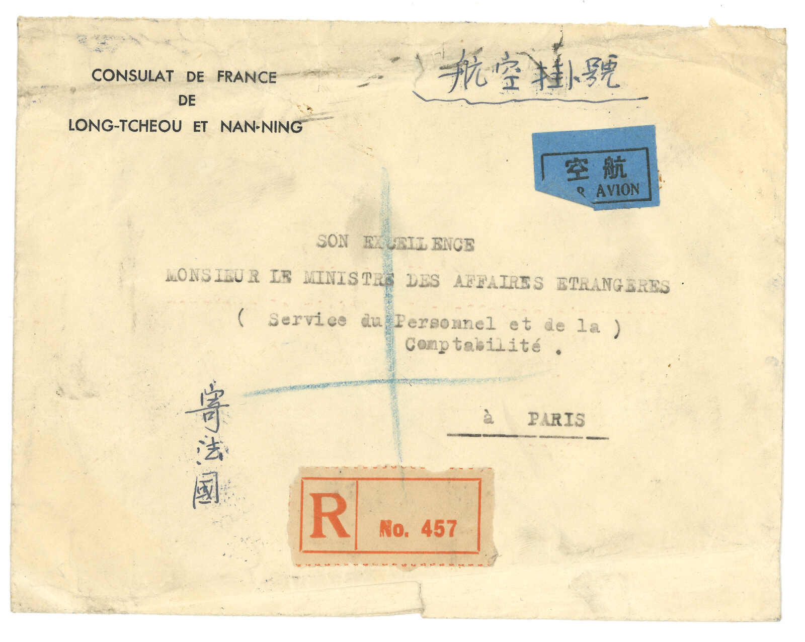 1948 French Consulate at Lungchow and Naning (30 Sep) to France. Registered airmail cover, f.w. SYS $100,000 in block of 23 on reverse, tied by Lungchow bilingual cds. Transit Canton (6 Oct). Slighly rough edges.