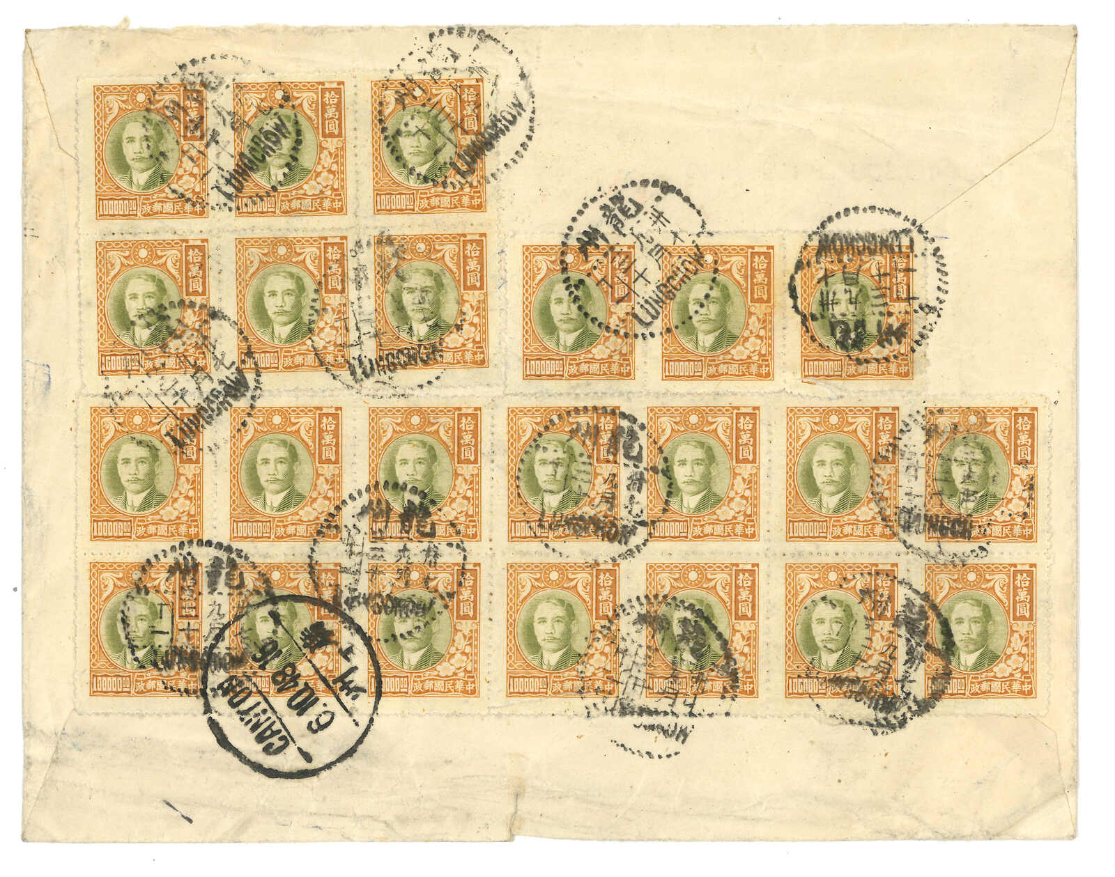 1948 Swatow (31 Mar) to Bangkok. Airmail cover, f.w. SYS $50,000 in block of 6 + surch $10,000 in pair, in total of $320,000, tied by Swatow bilingual cds. Last day cover of postage between 16 and 31 Mar 1948. Scarce heavy mail