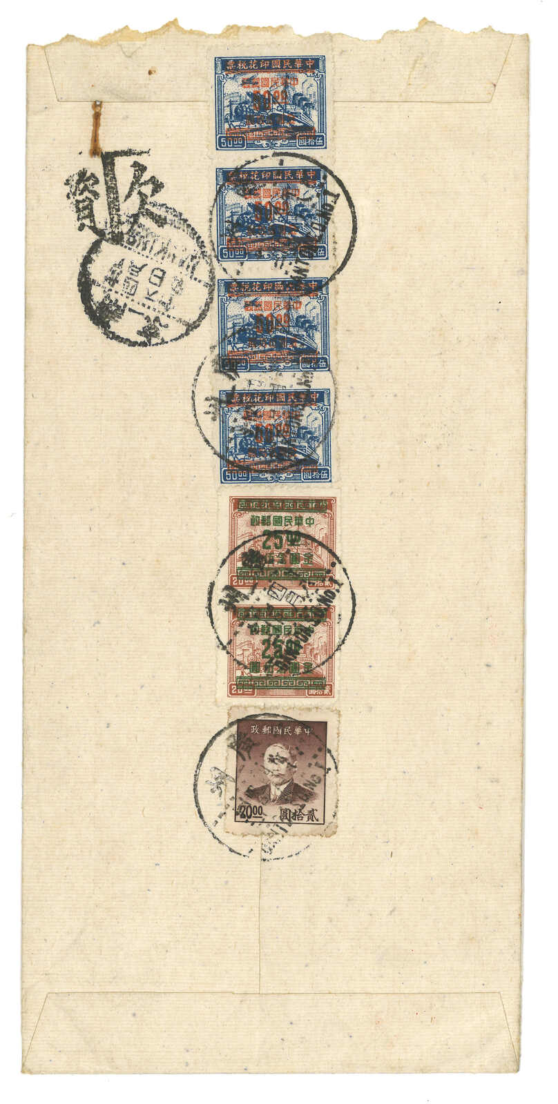 1949 Canton (4 Apr) to Minister of the Interior, Nanking. Airmail cover, f.w. Revenue issue surch Gold Yuan $50 in strip of 4 + $25 in pair + SYS $20 on reverse, tied by Canton SO No.1 bilingual cds, alongside with T mark.