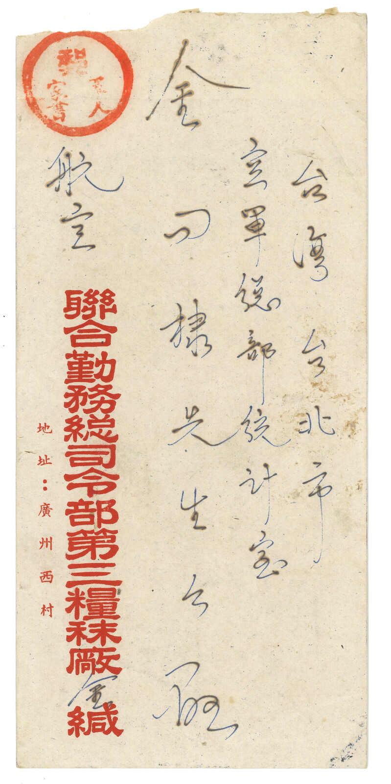 1949 Headquarter of the Combined Logistics Command from Canton (16 May) to Taipeh, f.w. Domestic Letter unit stamp on reverse, tied by Canton bilingual cds. On front showing “Letter of Military Family” circular seal in red.