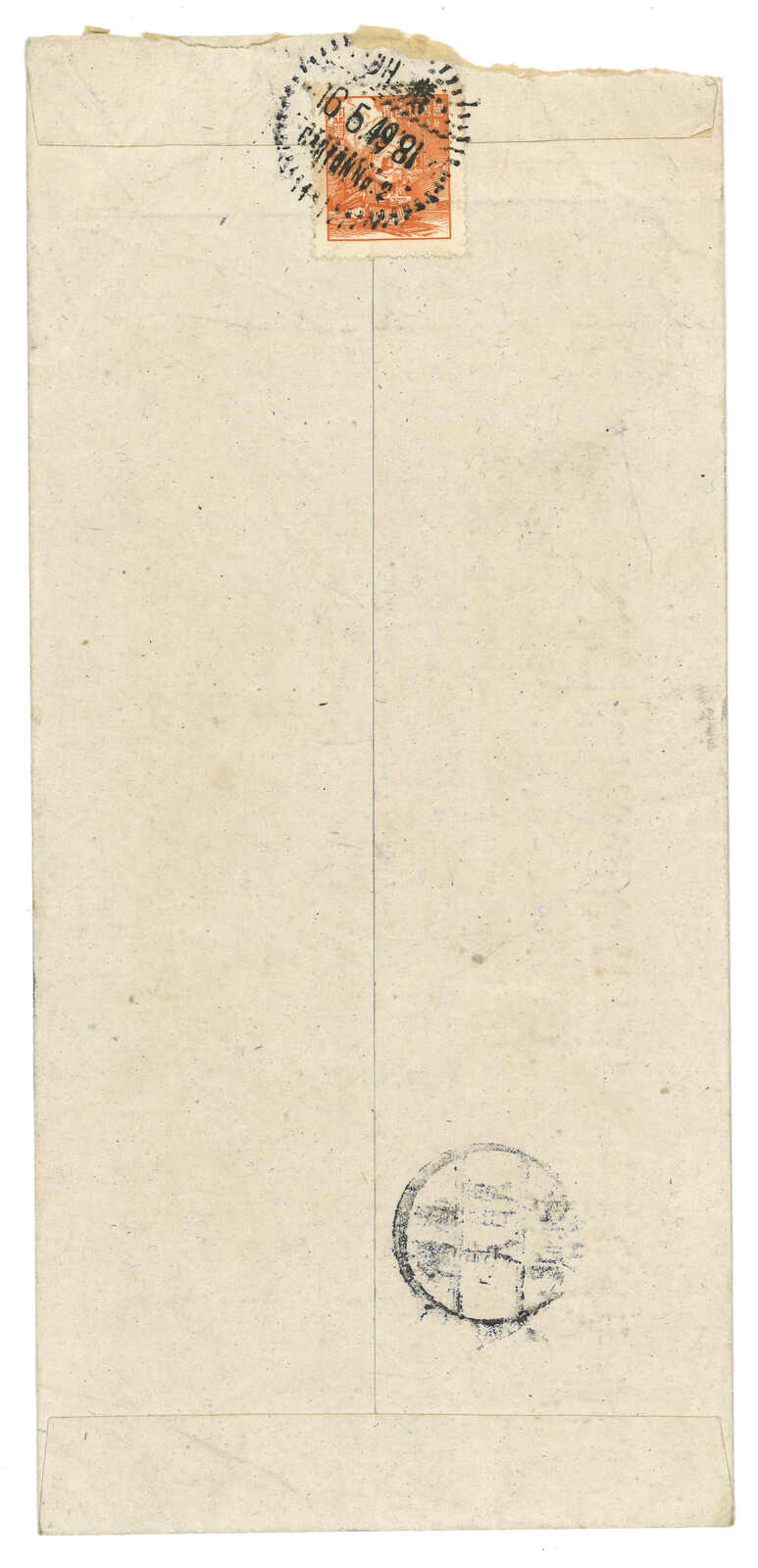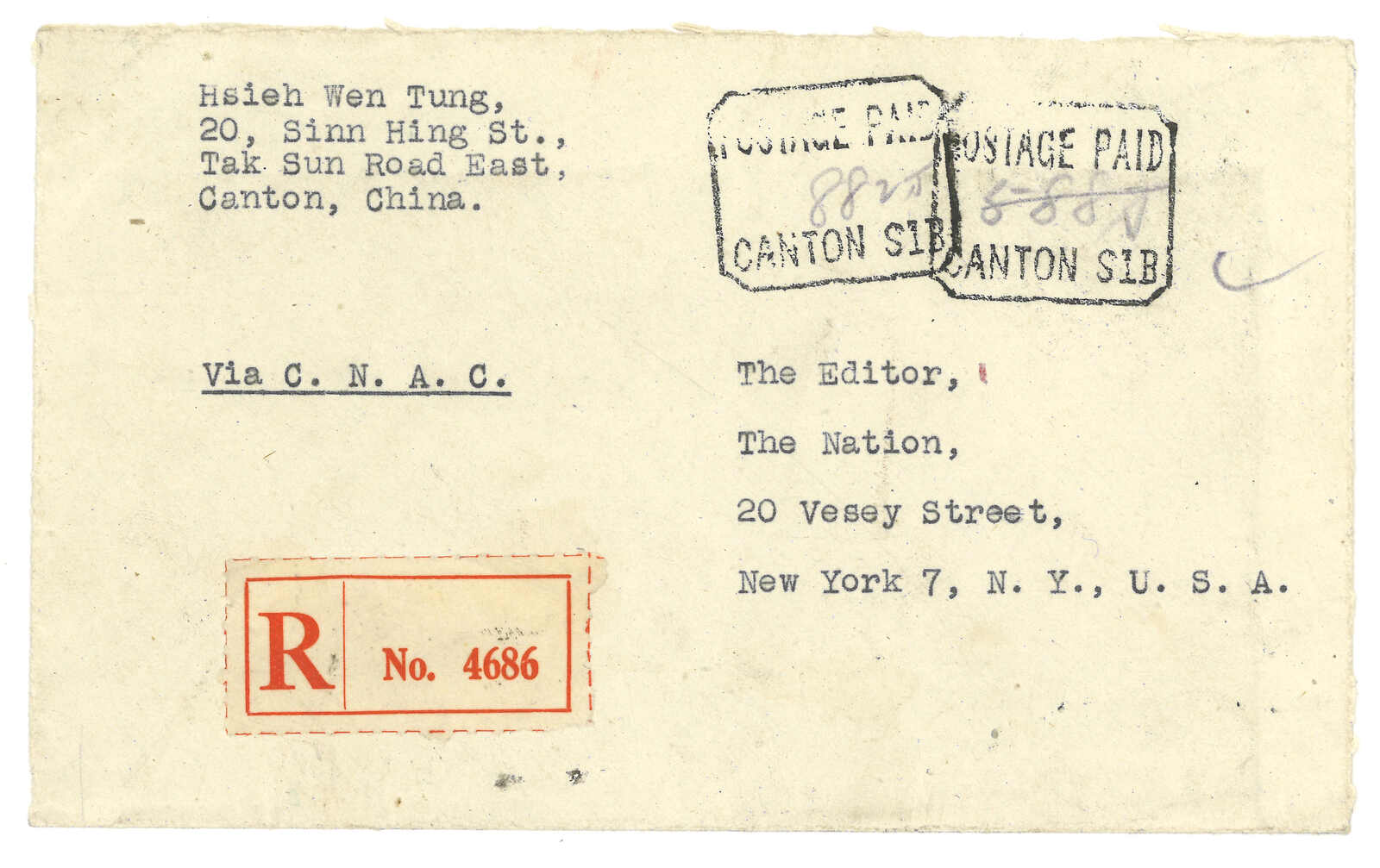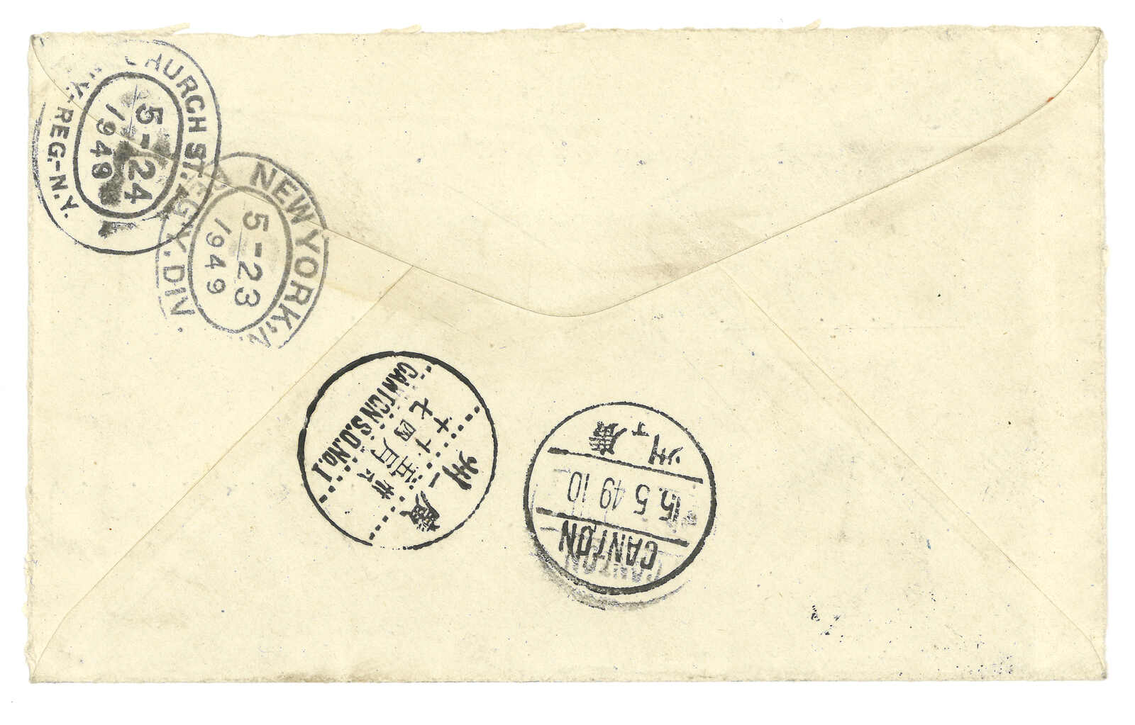 1949 Canton (14 May) to USA. Airmail cover, applied with “POSTAGE PAID / CANTON SIB” with handfilled postage. On reverse Canton bilingual cds. Arrived New York (23 May).