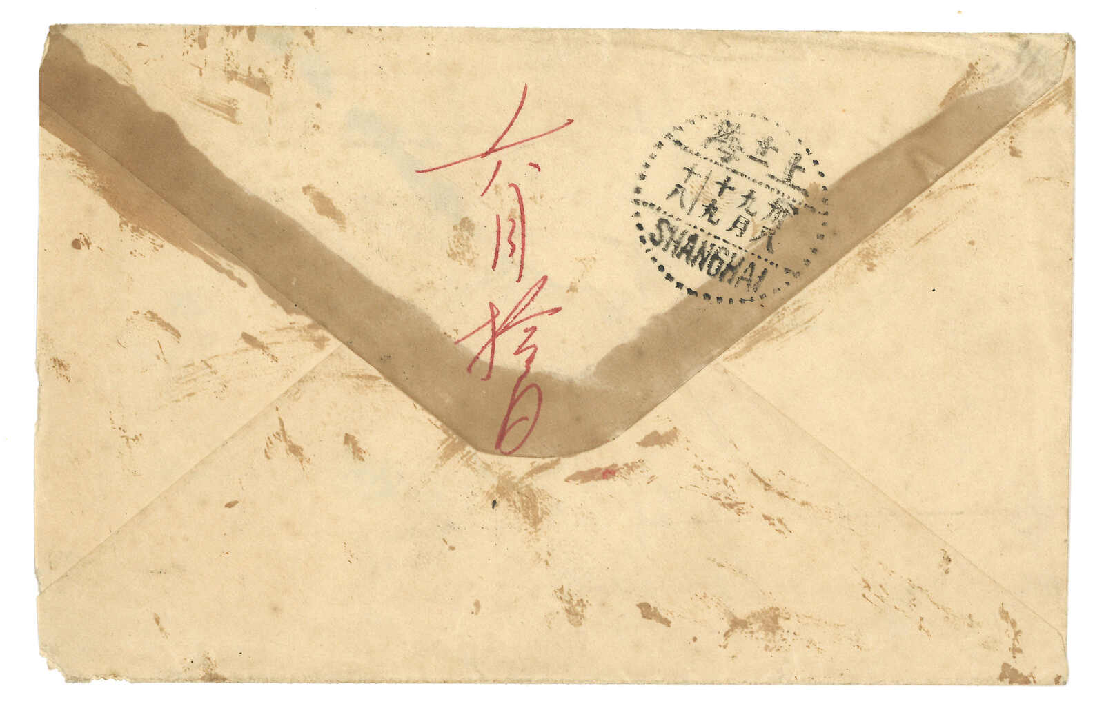 1949 Shaho (10 Jun) to Shanghai, applied with octagonal “Domestic Postage Paid / Shaho” h.s and Shaho (Punyu) origin cds. Arrived Shanghai (19 Sep). With stains. Long transit time probably due to the civil war.