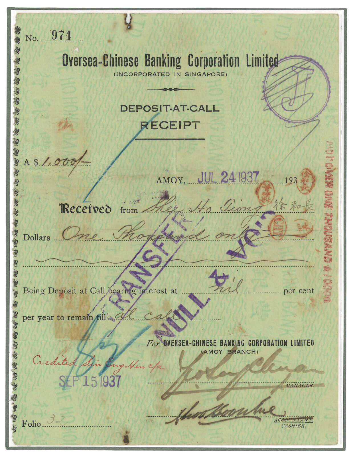 ca 1940 Remittance red band cover from OCBC Muar to Chowan, frankless, applied with OCBC Mura remittance mark. Cover opened out for display. Plus a deposit-at-call receipt of OCBC Amoy.