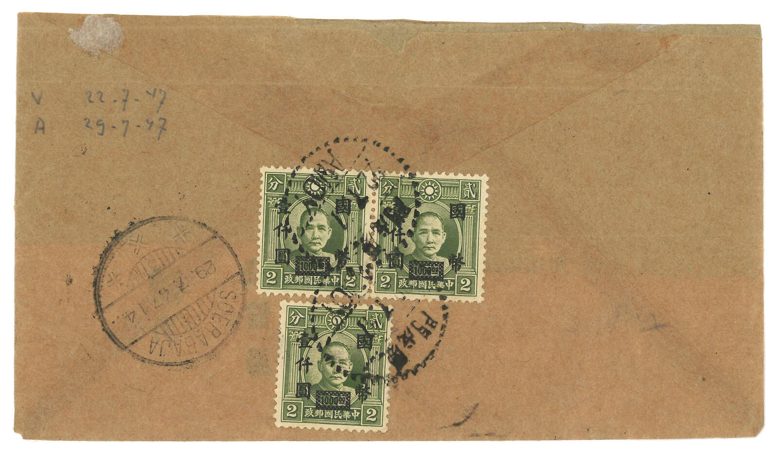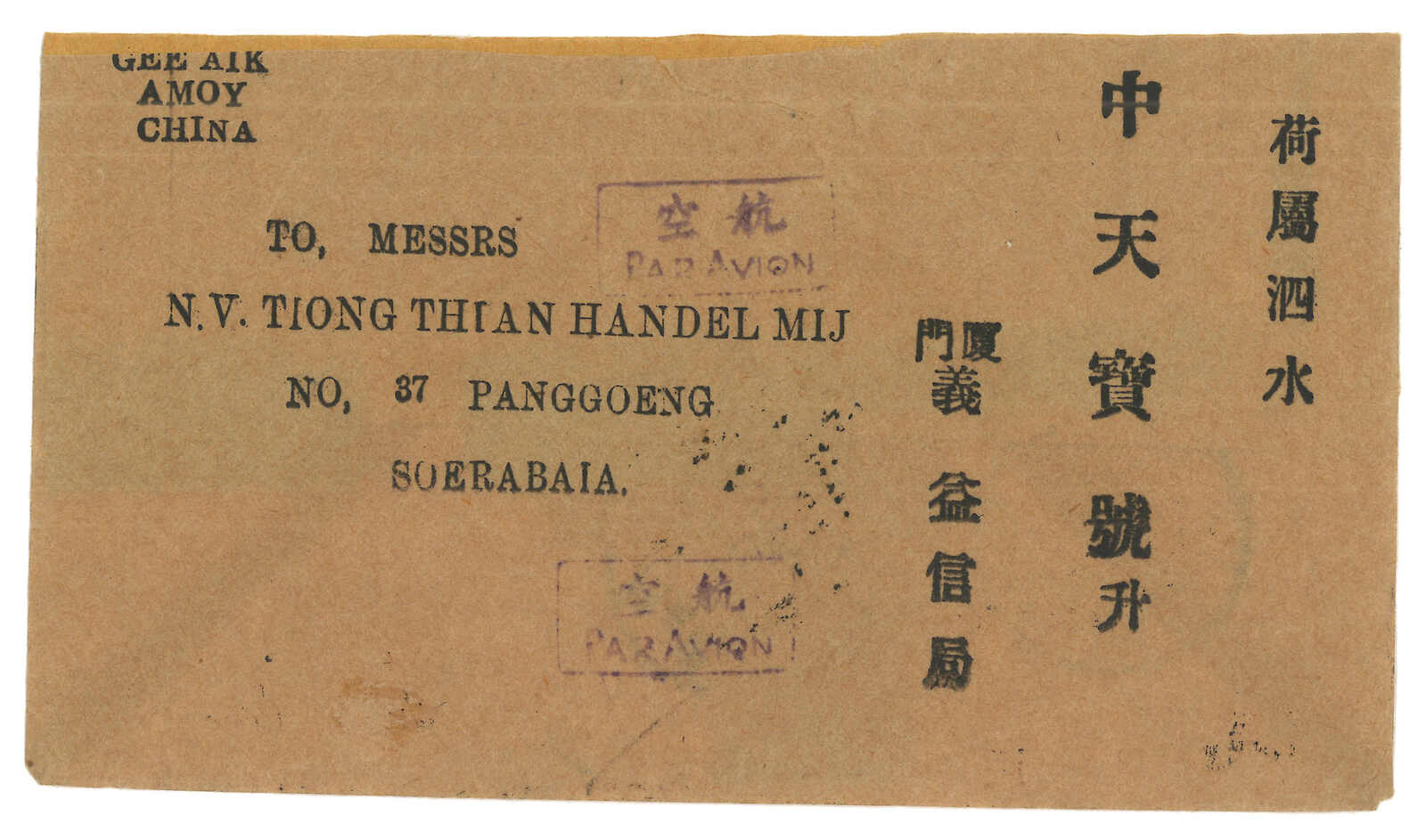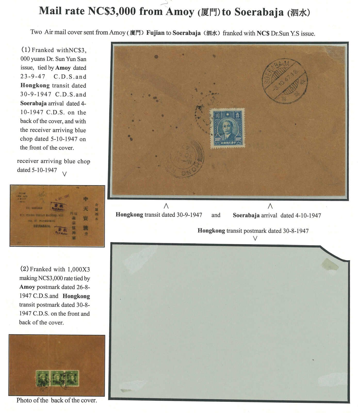 1947 (22 Jul) Huipi (receipt of remittance) from Amoy to Soerabaja. Airmail cover, f.w. SYS surch CNC $1000 x3, tied by Amoy bilingual cds. Arrived Soerabaja (29 Jul). Huipi to Indonesia usually sent individually by airmail