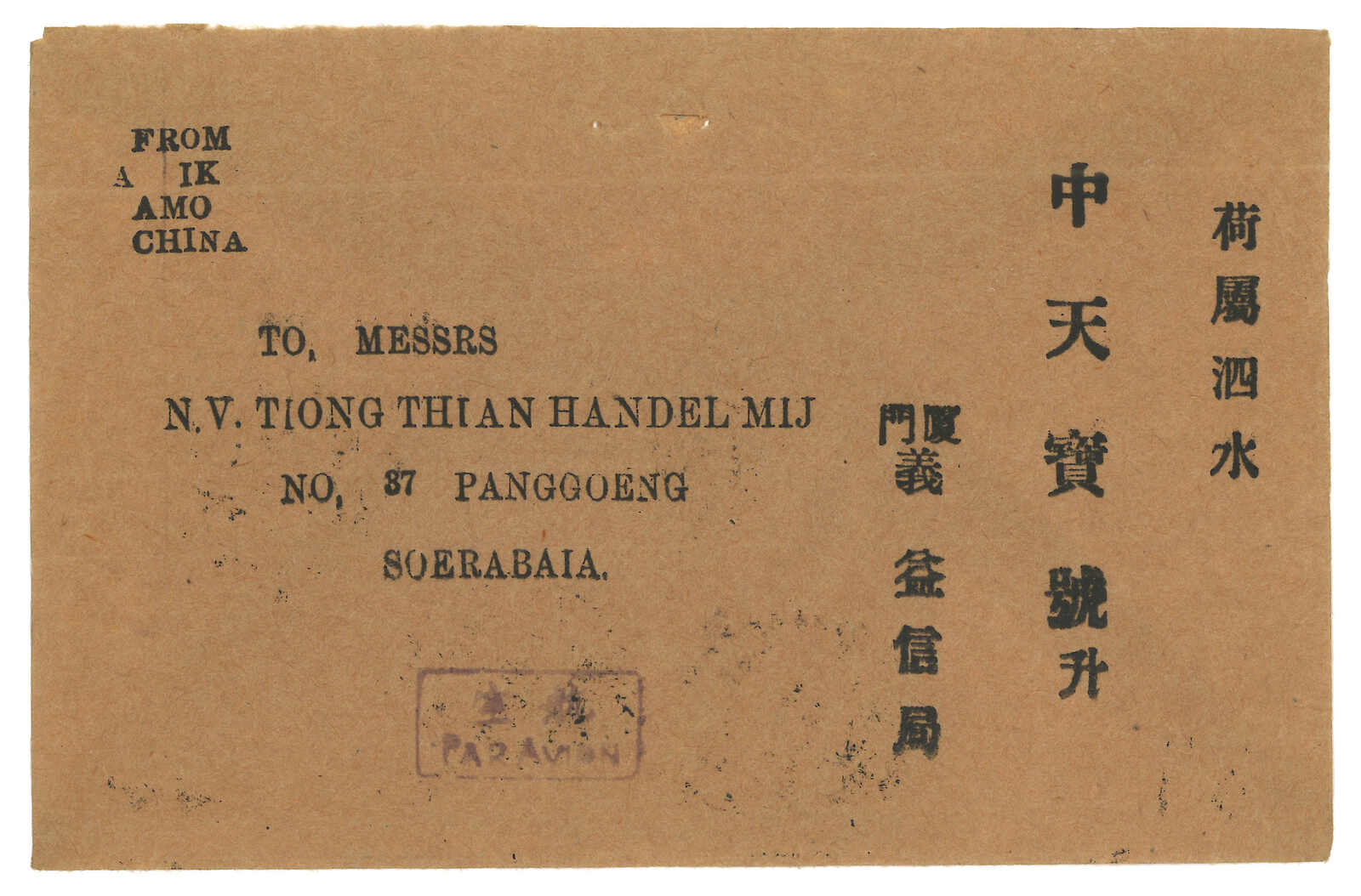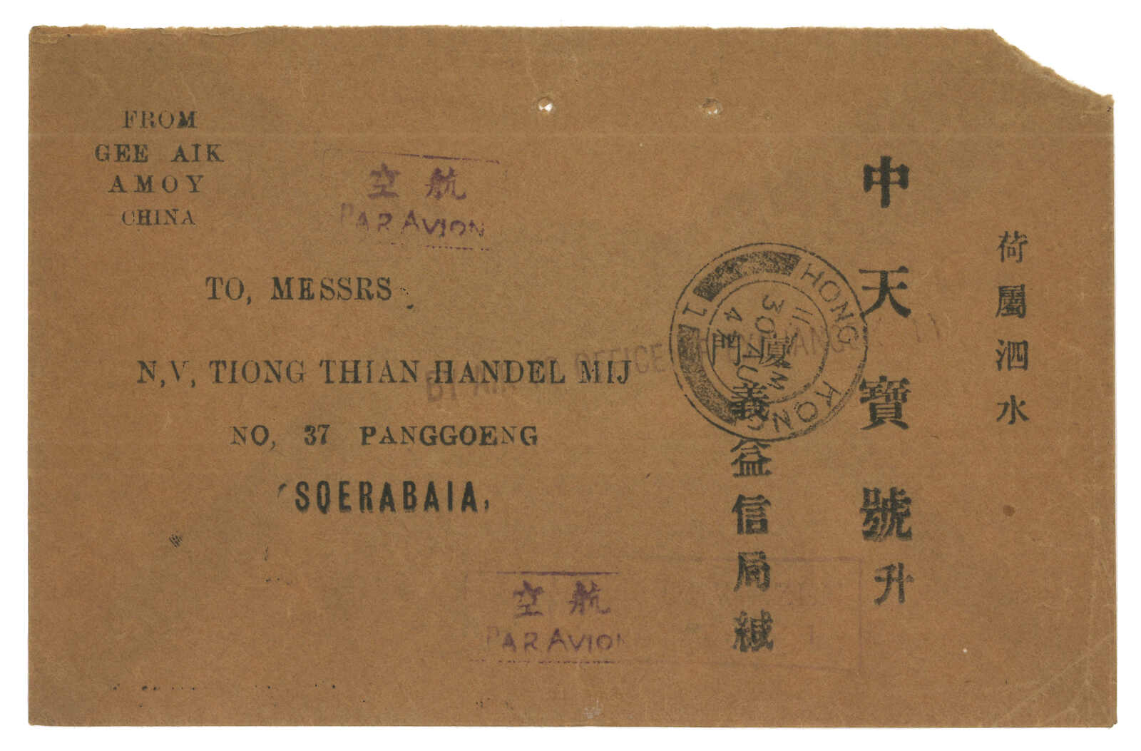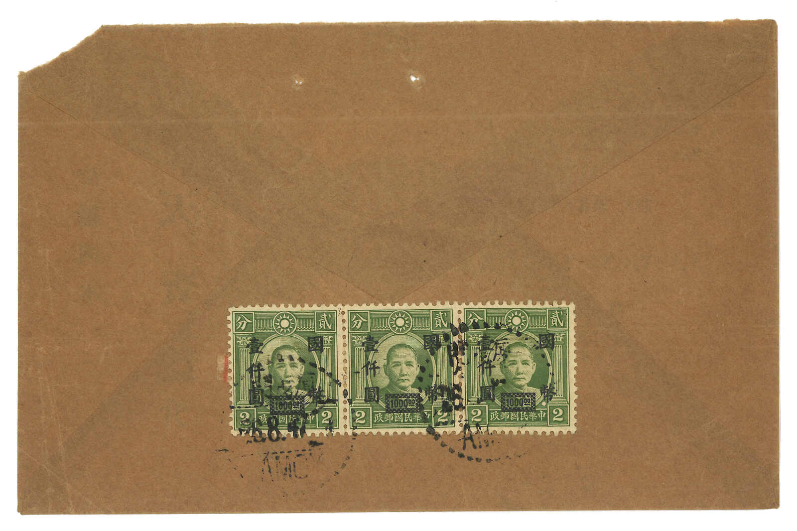 1947 (22 Jul) Huipi (receipt of remittance) from Amoy to Soerabaja. Airmail cover, f.w. SYS surch CNC $1000 x3, tied by Amoy bilingual cds. Arrived Soerabaja (29 Jul). Huipi to Indonesia usually sent individually by airmail