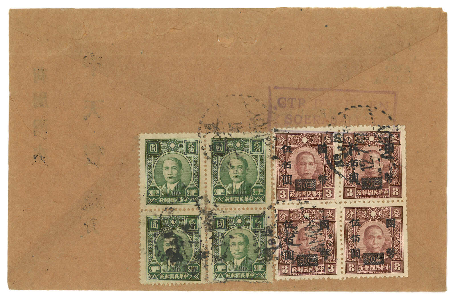 1947 (24 Jul) Huipi (receipt of remittance) from Amoy to Soerabaja. Airmail cover, f.w. SYS $200 in block of 4 + surch CNC $500 in block of 4, in total of $2800 international airmail rate, tied by Amoy bilingual cds. Showing