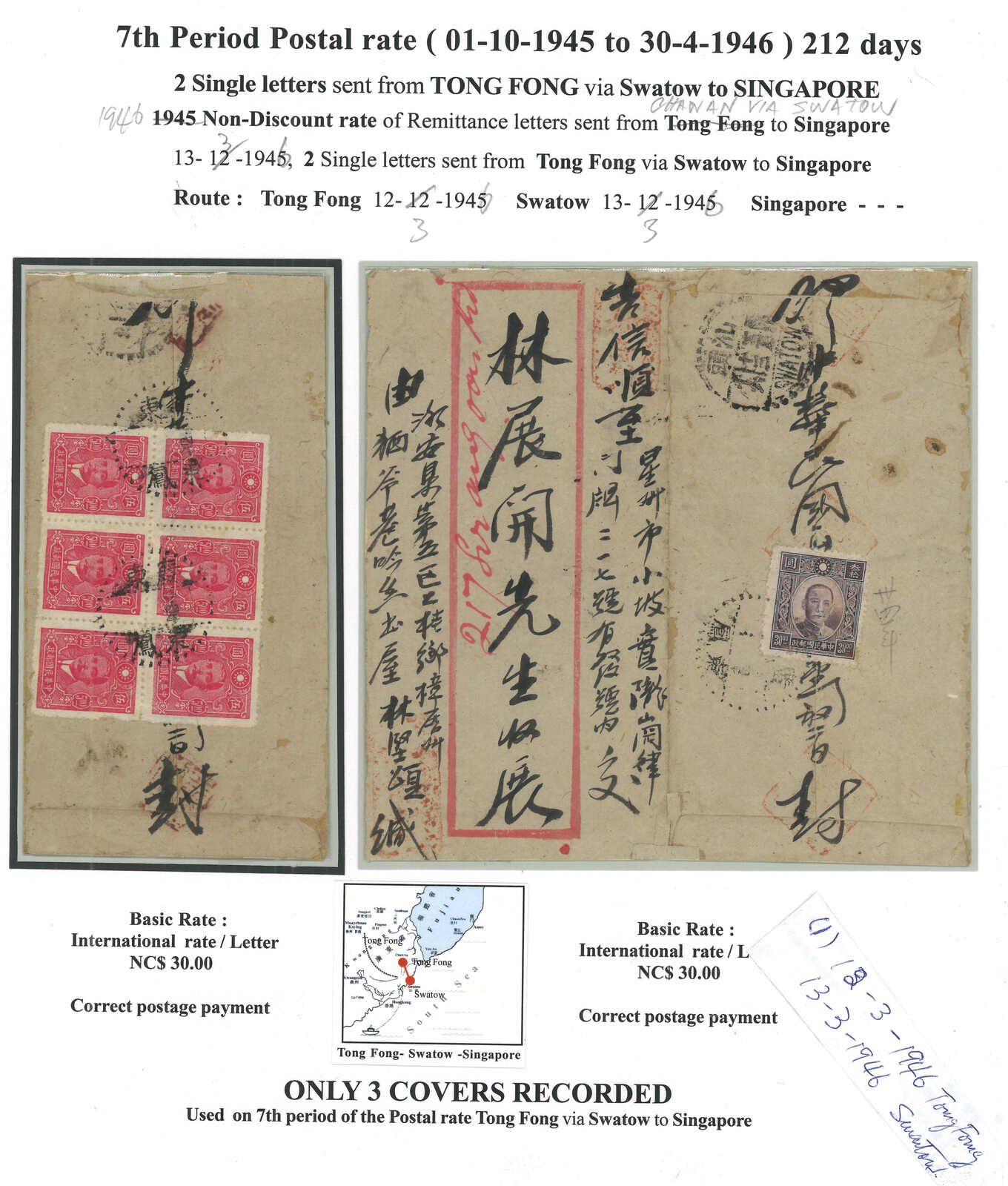 1945 a pair of Huipi (receipt of remittance) from Tungfeng to Singapore, both f.w. SYS issues in value of $30 for international letter rate, tied by Kwangtung Tungfeng cds. Transit Swatow. Example of not enjoying Huipi