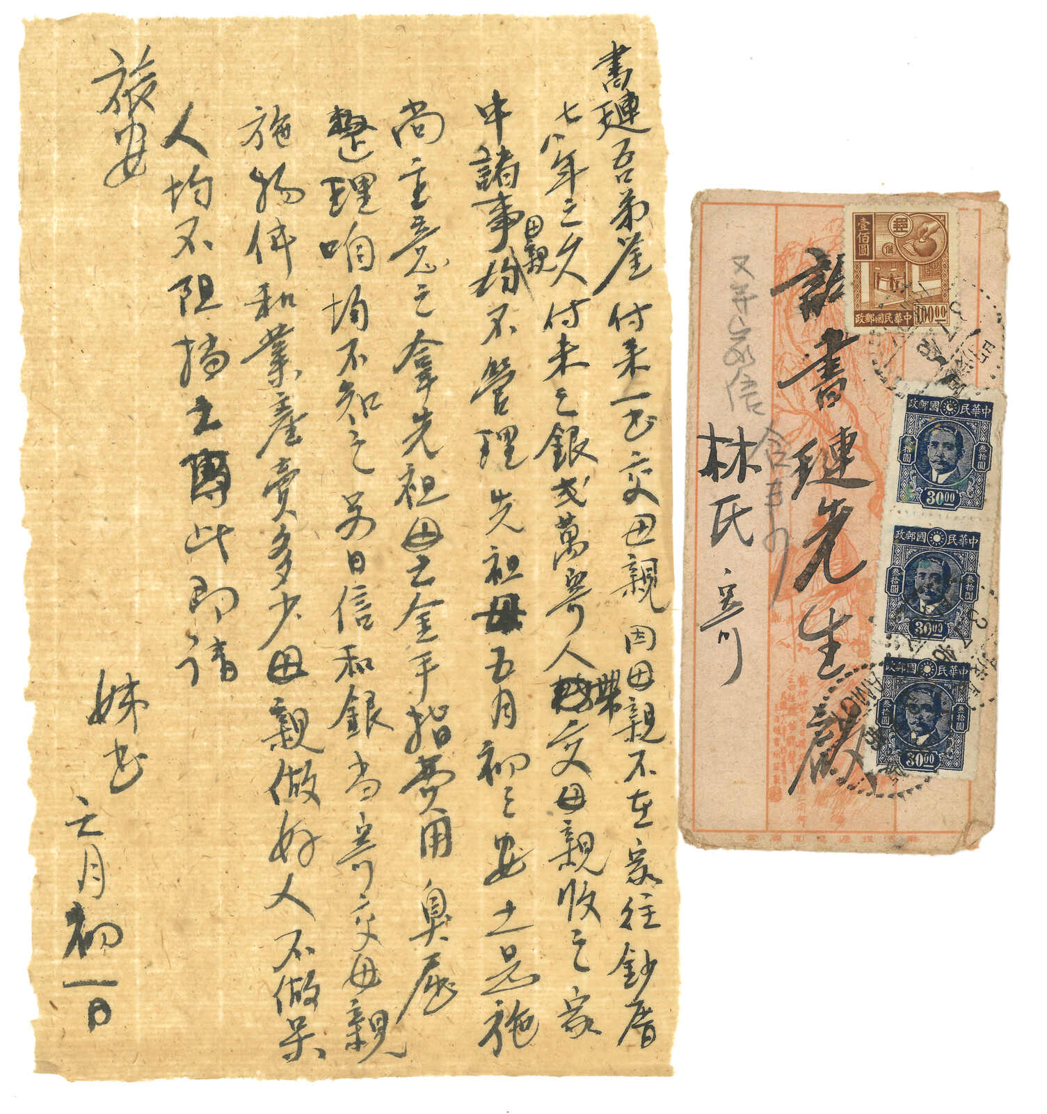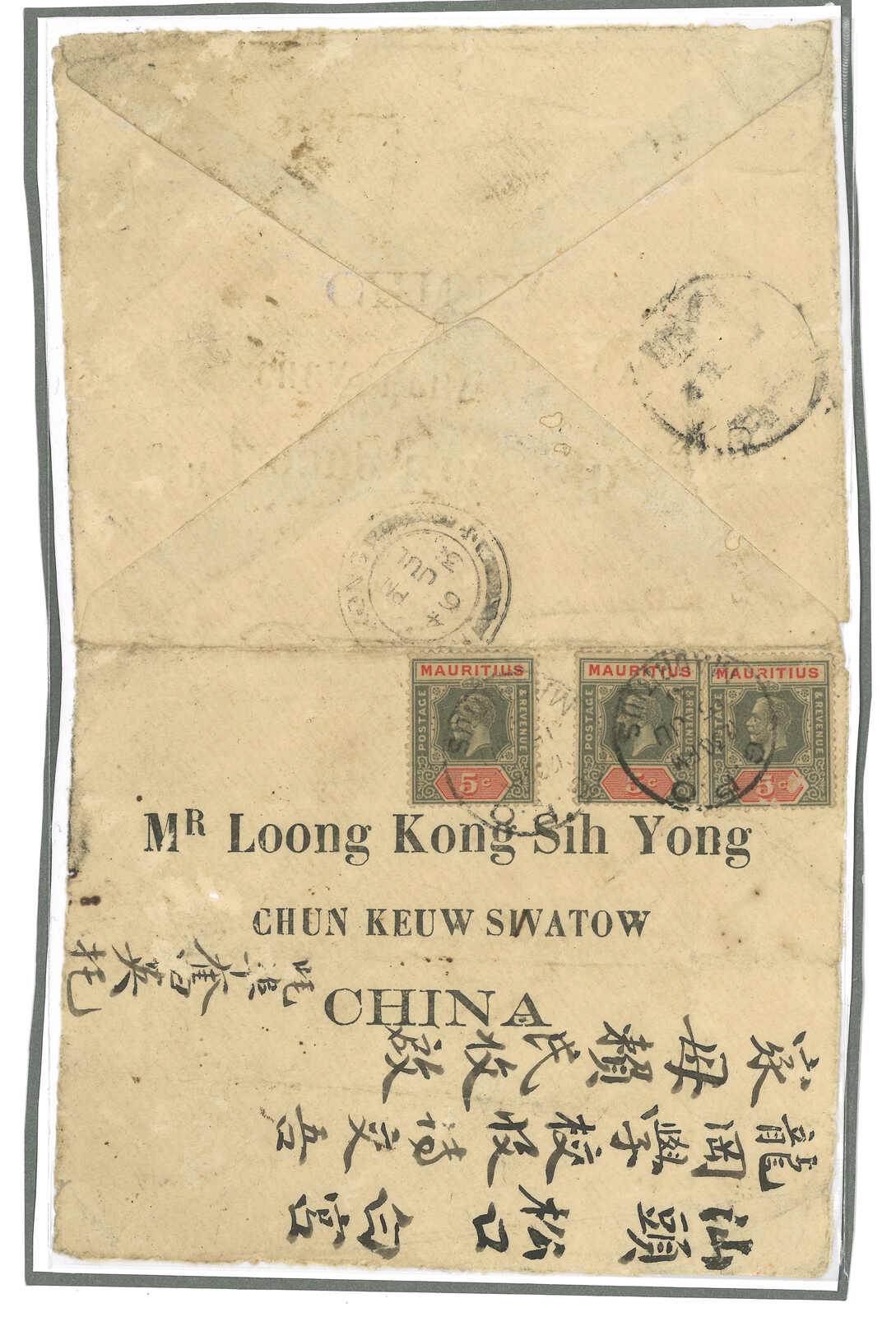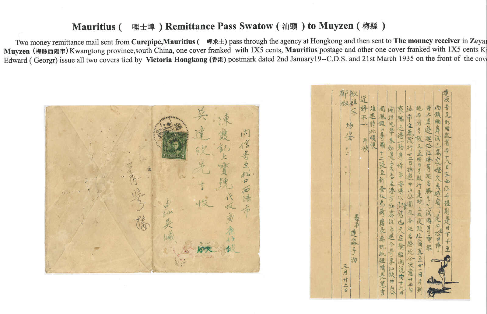 1930s a pair of domestic and incoming Qiaopi, former from Swatow to Tsungkwo, latter from Mauritius to Meihsien. Both opened out for display.