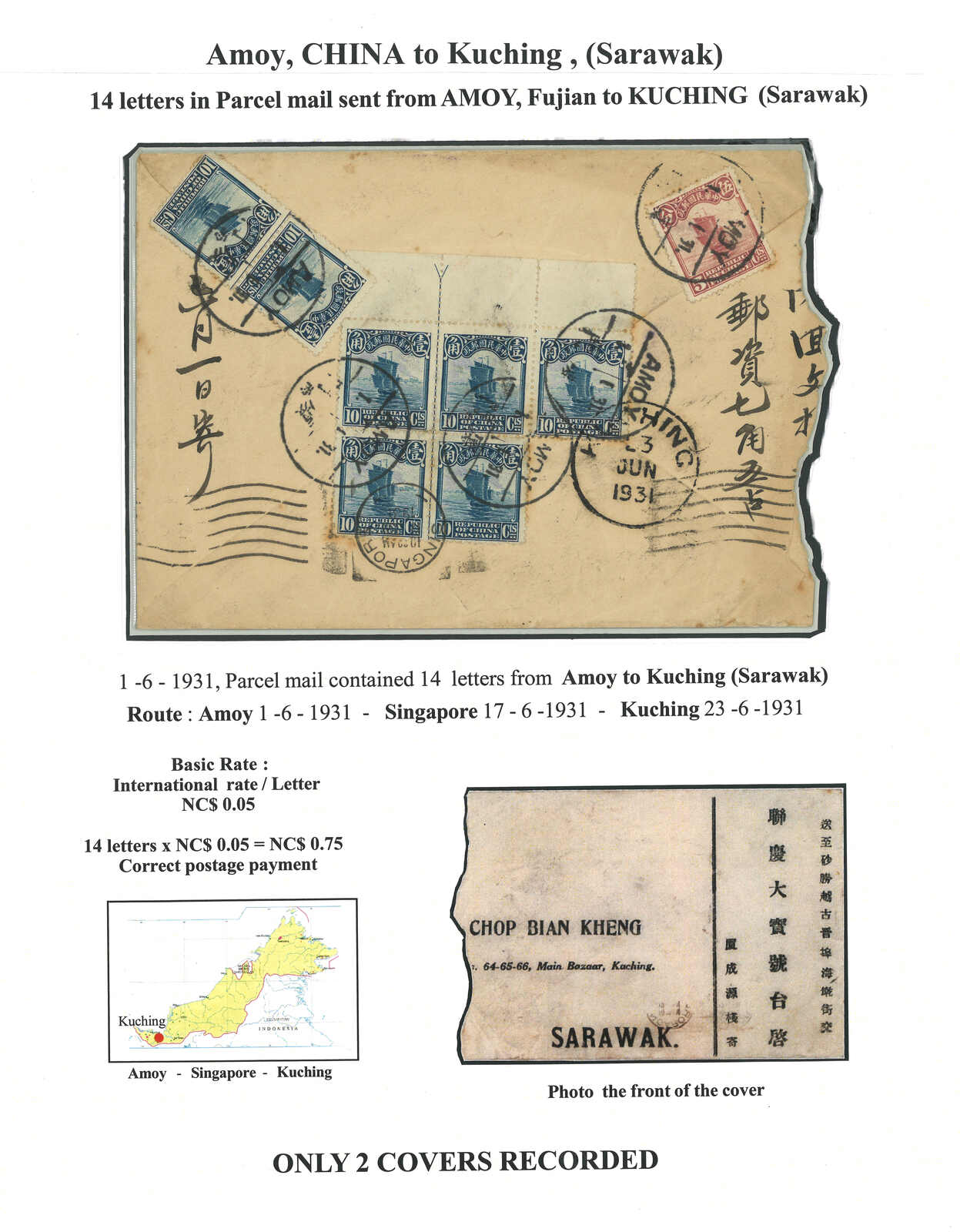 1931 (1 Jun) Huipi (receipt of remittance) bulk mail stating containing 15 letters from Amoy to Kuching, Sarawak, f.w. Junk x 8, in total of 75c (5c per letter), tied by Amoy bilingual cds. Transit Singapore (17 Jun). Arrived