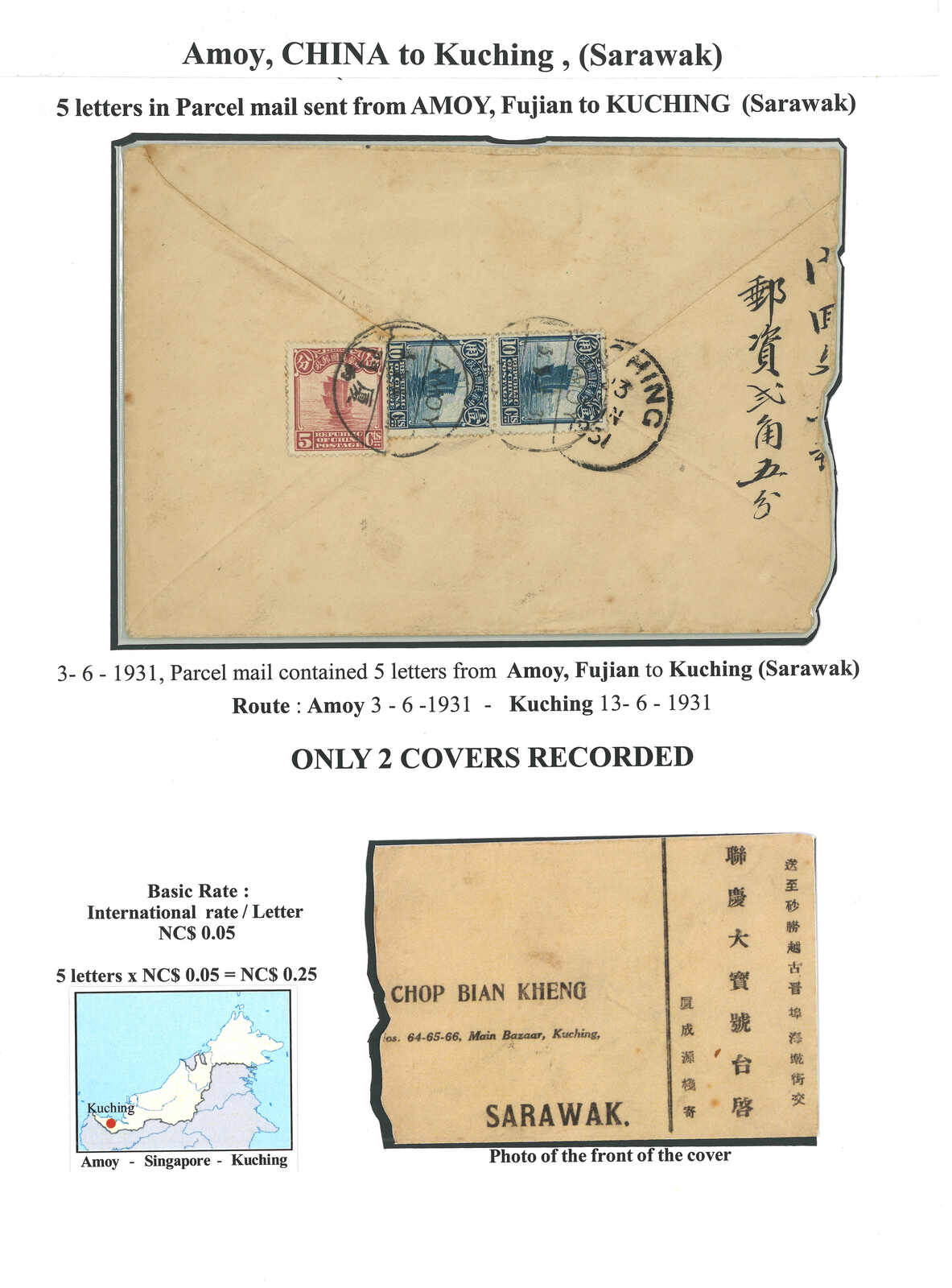 1931 (3 Jun) Huipi (receipt of remittance) bulk mail stating containing 5 letters from Amoy to Kuching, Sarawak, f.w. Junk 5c + 10c in pair, in total of 25c (5c per letter), tied by Amoy bilingual cds. Arrived Kuching (13 Jun).
