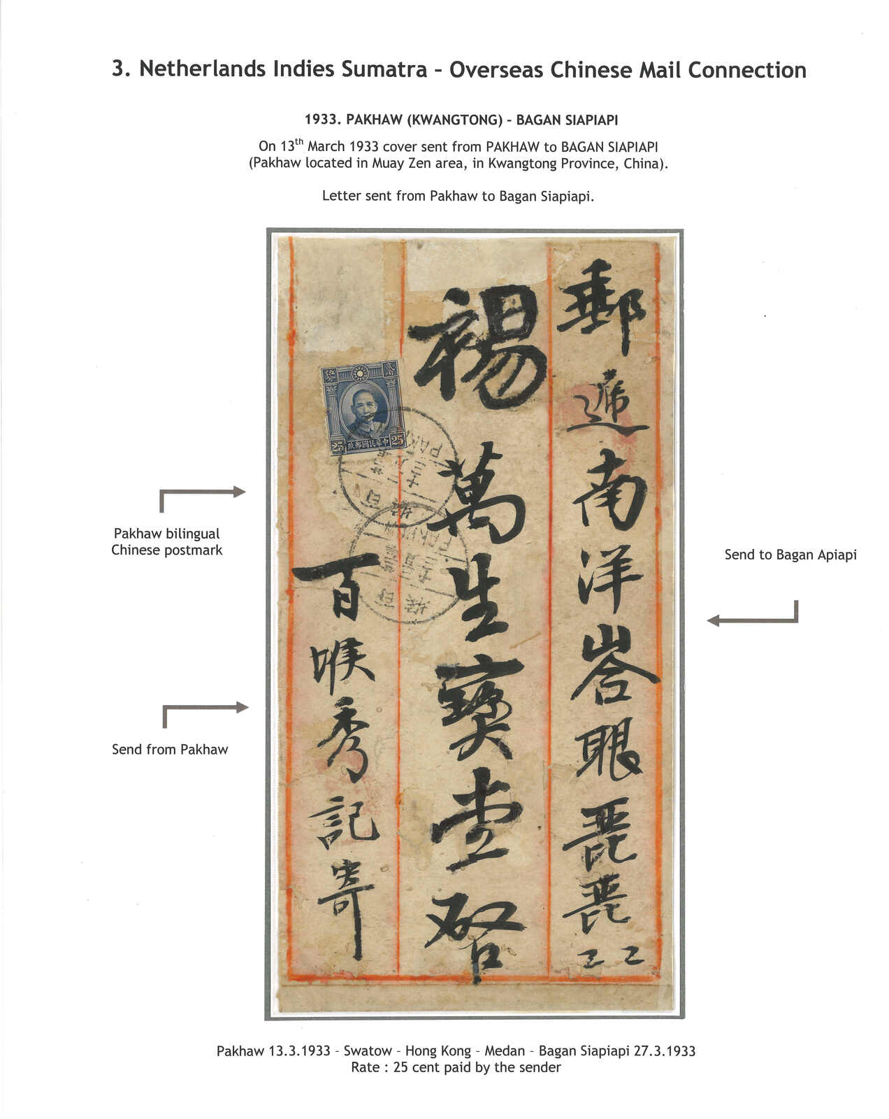 1933 (13 Mar) Huipi (receipt of remittance) from Pakhow to Bagan Apiapi, f.w. SYS 25c, tied by Pakhow bilingual cds. Arrived Apiapi (27 Mar). Scarce Huipi to Dutch East Indies.