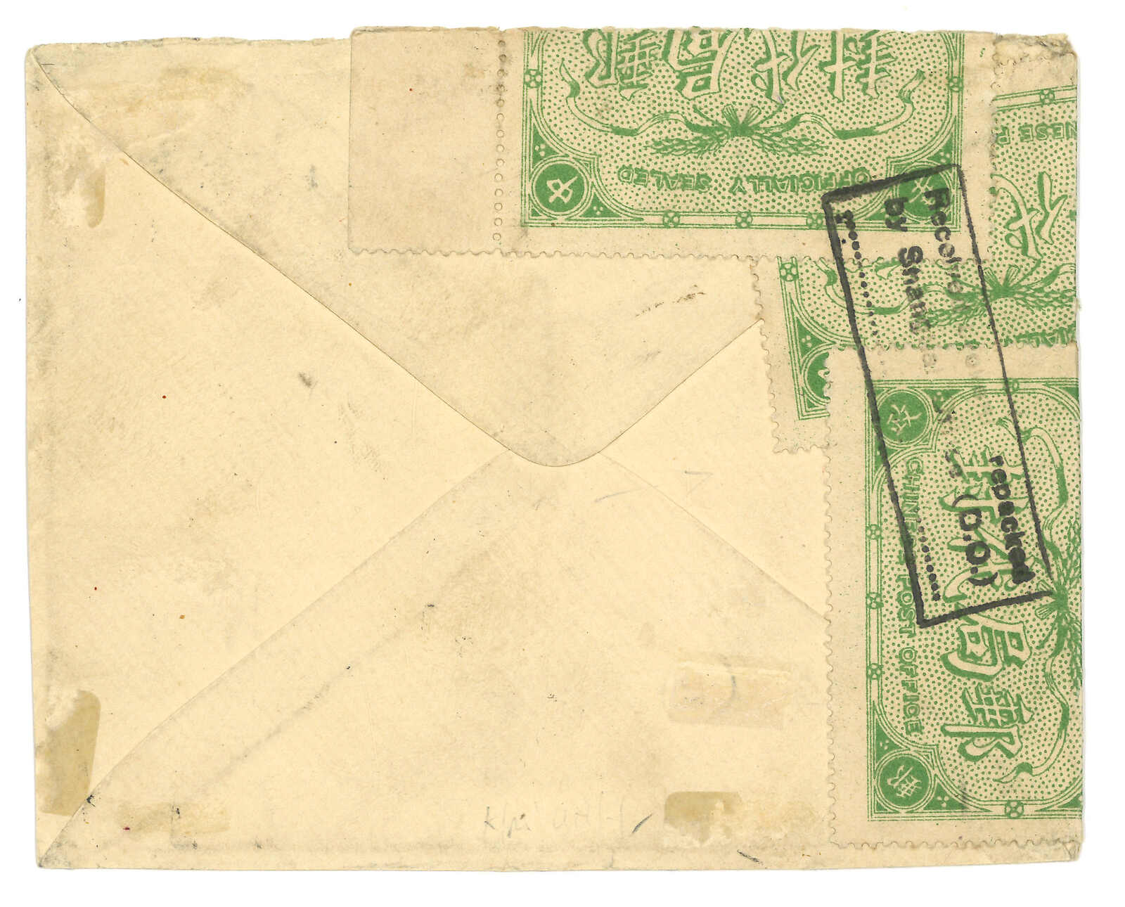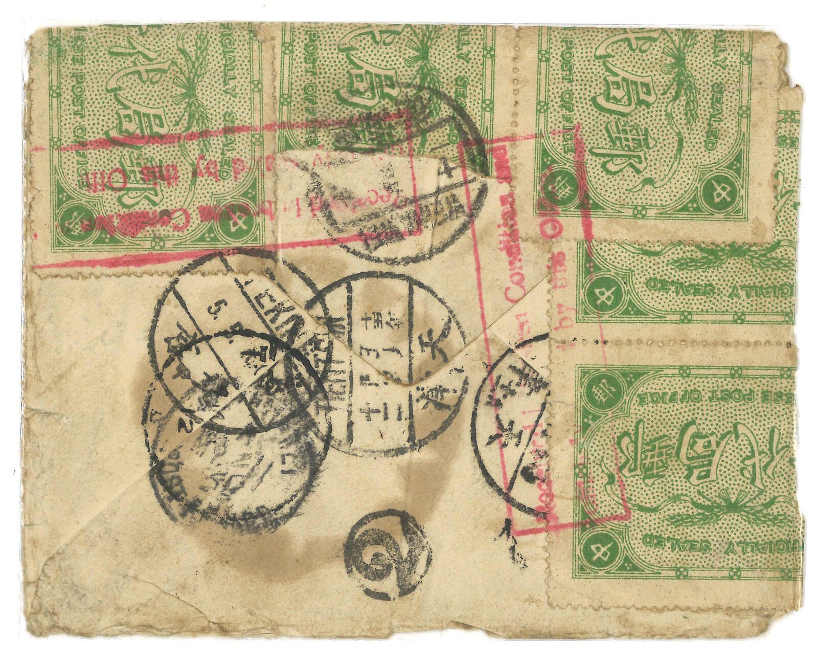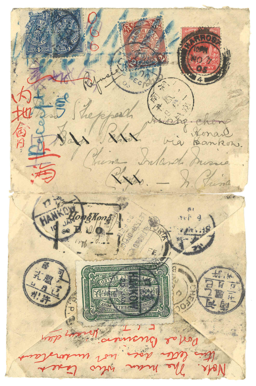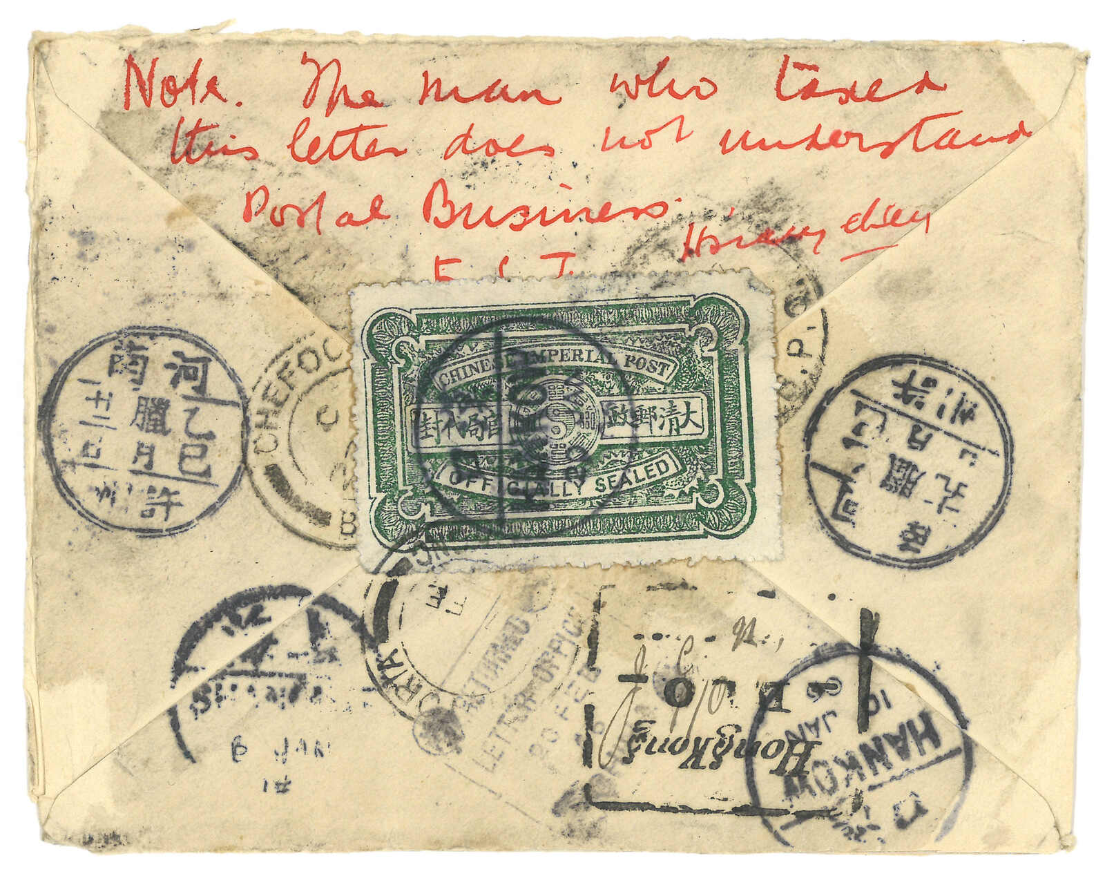 191 cover image1905 England (7 Nov) to Chefoo, redirected to Shanghai and Hsiangchow, f.w. KGV 1d, tied by Harrogate cds. Transit Chefoo BPO (23 Dec). In combintion with Coiling Dragon 2c, tied by Chefoo Chinese PO (23 Dec) cds. Redirecting to Shanghai and arrived on 6 Jan. Further redirected to Hsiangchow and f.w. Postage due 4c in pair, tied upon transit by Hankow (10 Jan) cds. On reverse with "Note. The man who taxed this letter does not understand postal business" annotation and the postage due stamps were crossed out and voided. Arrived Hsiangchow (13 Jan) and departed from Hsiangchow again on 16 Jan. 1st issue officially sealed label was affixed on reverse with Hankow (20 Jan) cds. The cover was sent to Hong Kong (17 Feb) with Victoria cds, DLO d.s. and Returned Letter Office d.s. Front and reverse rejoined for display. Extraordinary and important cover showcasing the earliest recorded usage of officially resealed label as well as errouenous levy of postage due and peculiar redirections. 2014 (13 Jan) Interasia Auction lot 3002.