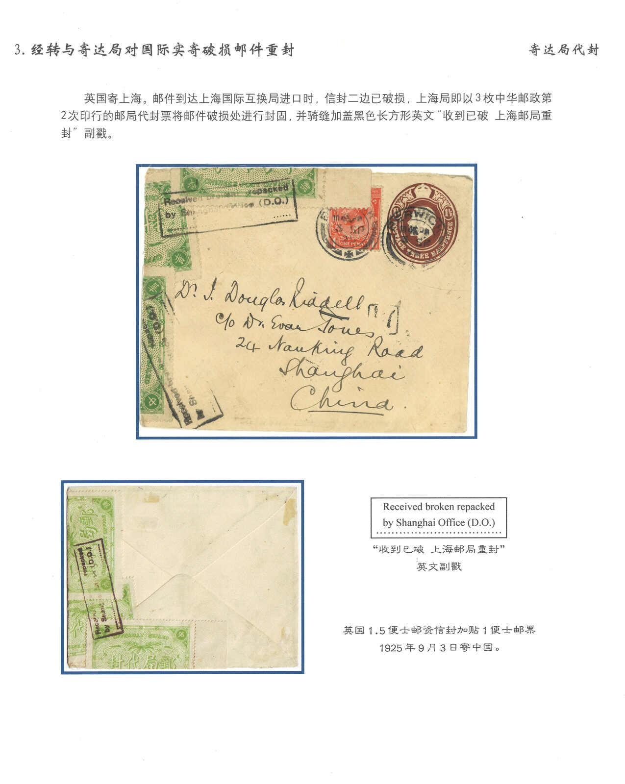 1925.9.3 英國1-1/2便士郵資封寄上海,加貼1便士。貼第二版民國代封票,鈐“Received broken repacked by Shanghai Office (D.O.)”指示戳。蕭宏著《中華郵政以代封票重封之破損郵件》圖9原件,2011年《亞洲郵學家》。(Image 1) (Image 2) (Image 3)