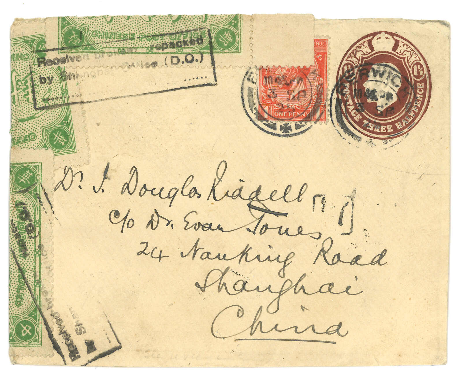 207 cover image1925 (3 Sep) Britain 1-1/2d stationery cover to Shanghai, uprated by with 1d. Applied with 2nd print officially resealed label with "Received broken repacked by Shanghai Office (D.O)" cachet. Illustration fig.9 in "Damaged Mails Salvaged by Reseal Labels of the Republican Post (1916-1949)" by Xiao Hong, Asian Philatelist 2011.