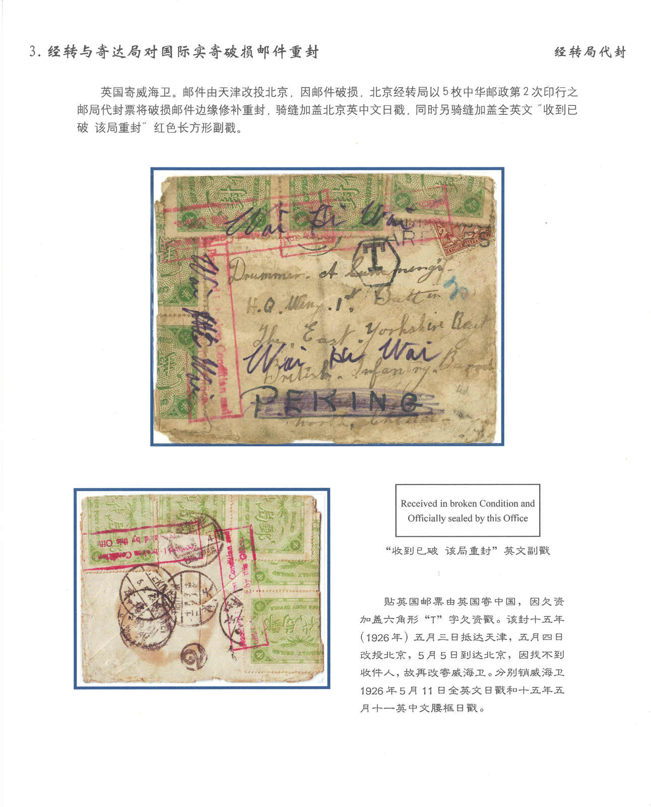 1926年英國寄天津,改寄北京及威海衛,貼英國票3-1/2便士,旁鈐T章。5.3抵天津,改寄北京(5.5)。貼第二版民國代封票,鈐“Received in broken Condition and Officially sealed by this Office”紅色橫戳。再改寄威海衛,5.11抵達。蕭宏著《中華郵政以代封票重封之破損郵件》圖3原件,2011年《亞洲郵學家》。(Image 1) (Image 2) (Image 3)
