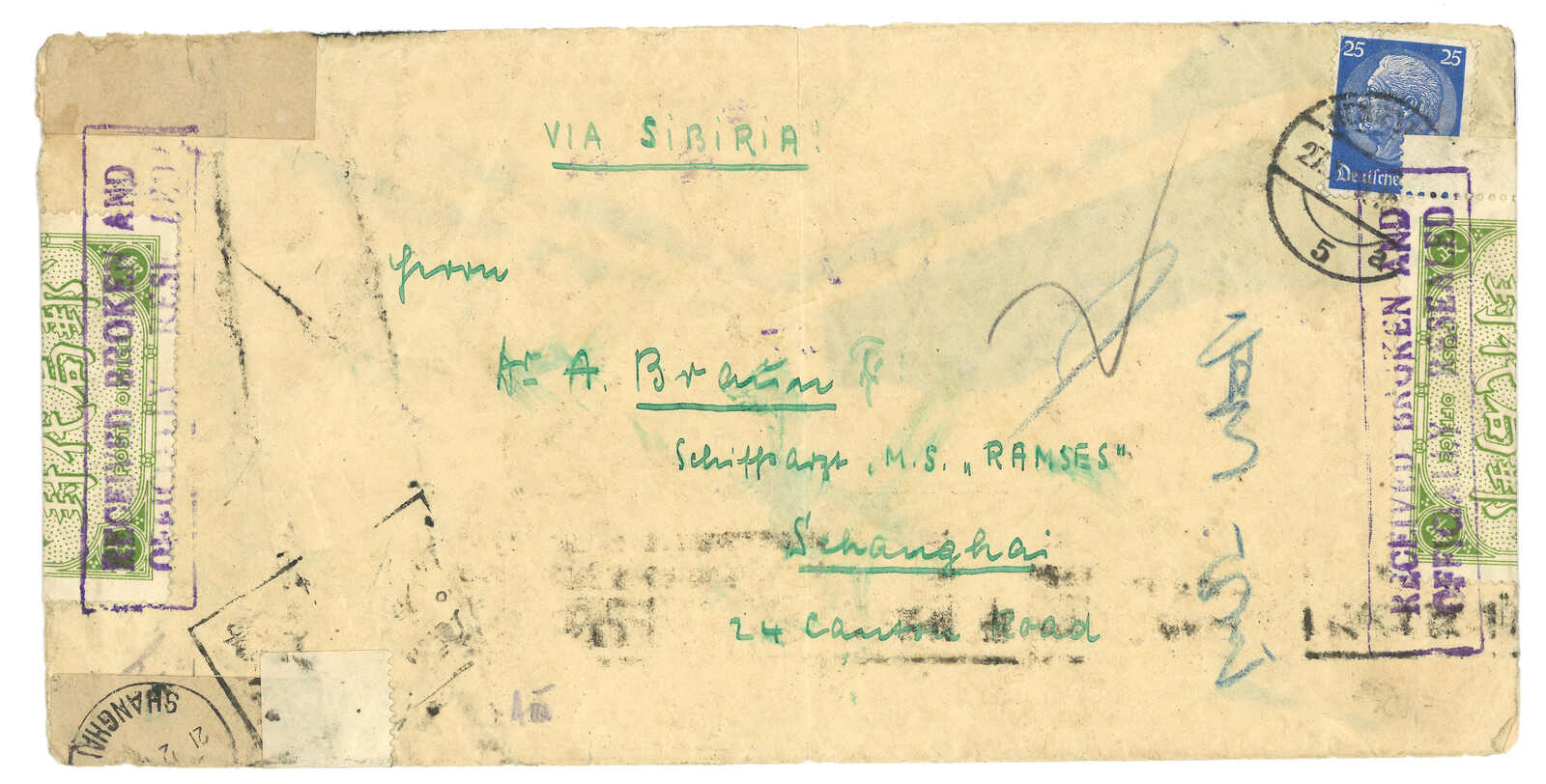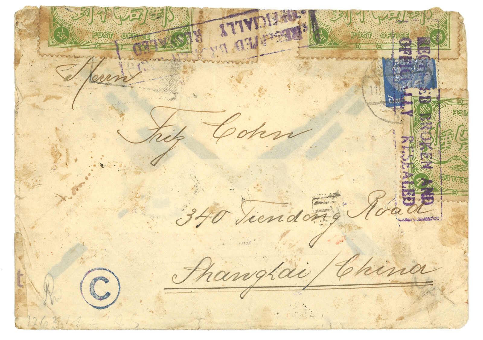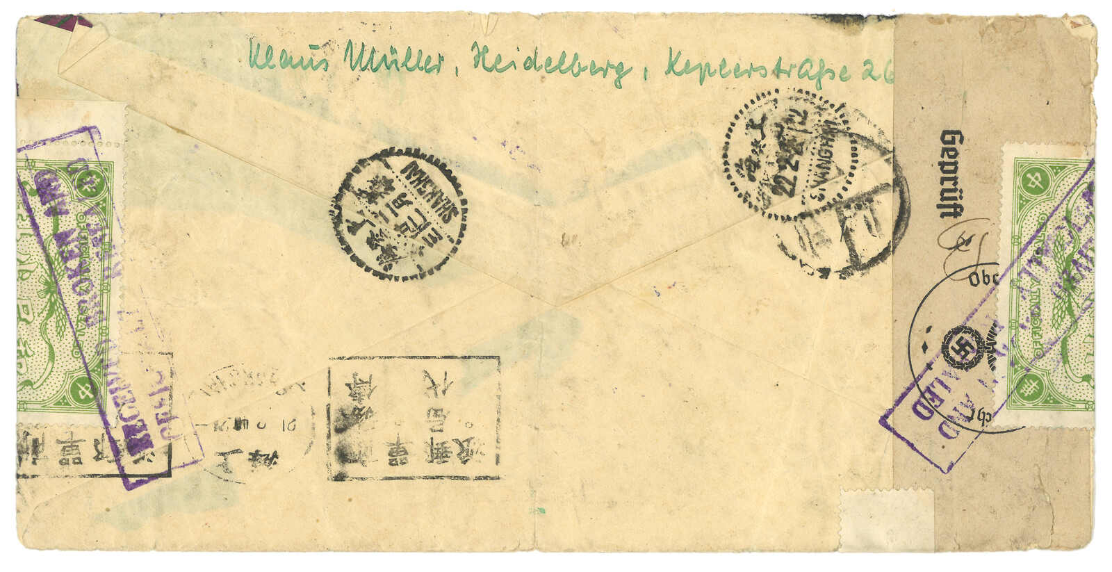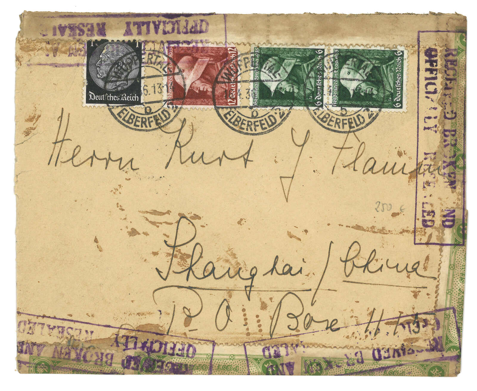 229 cover image1936 Germany (16 Apr) to Shanghai, f.w. German issue x4, tied by Wuppertal cds. In combination with 6th print officially resealed label and "RECEIVED BROKEN AND OFFICIALLY RESEALED" horizontal h.s. Showing Shanghai merchant circular h.s.