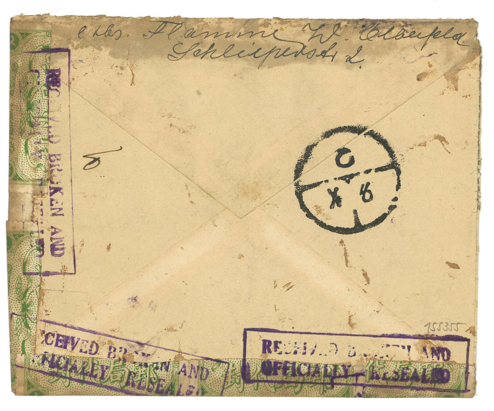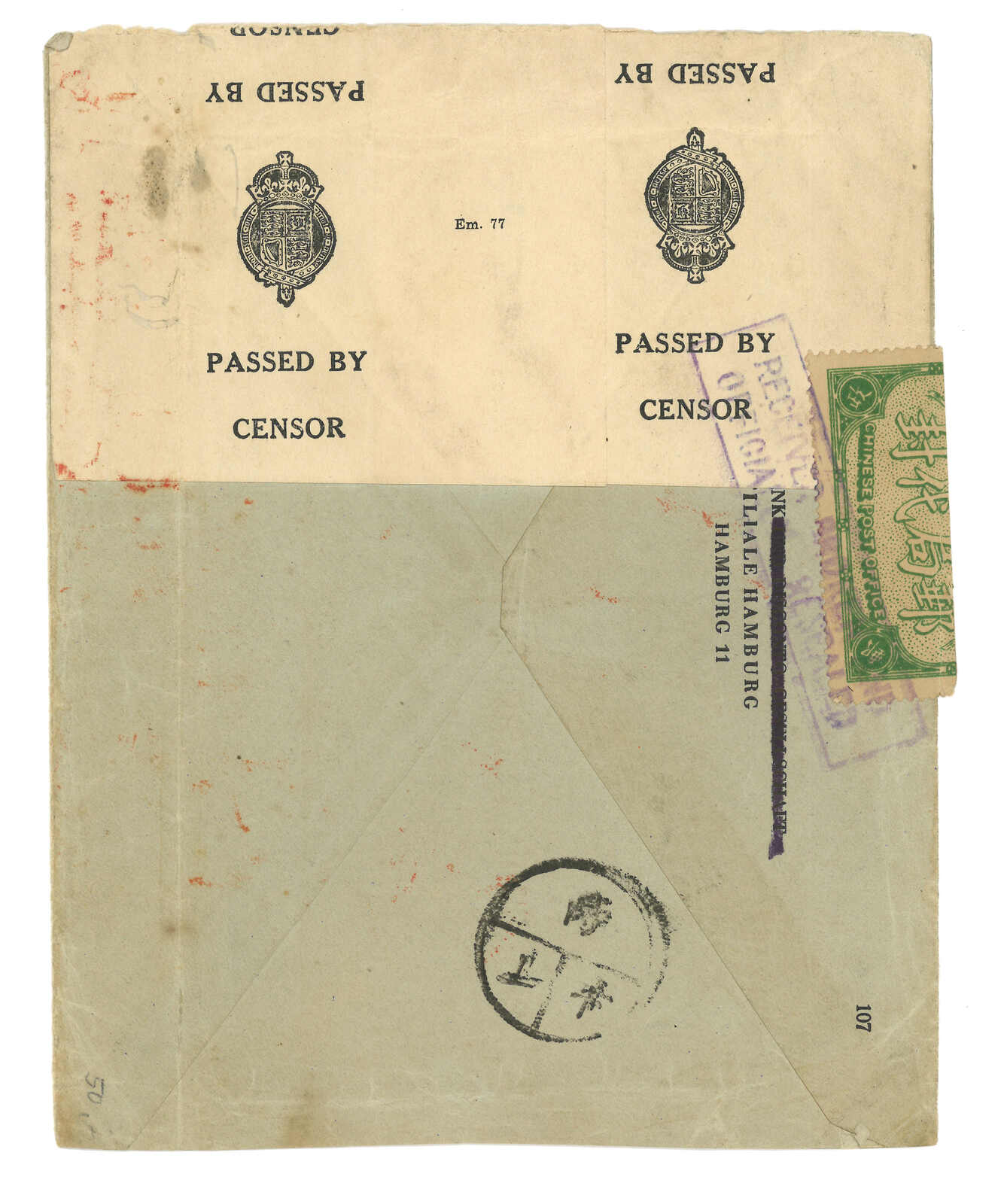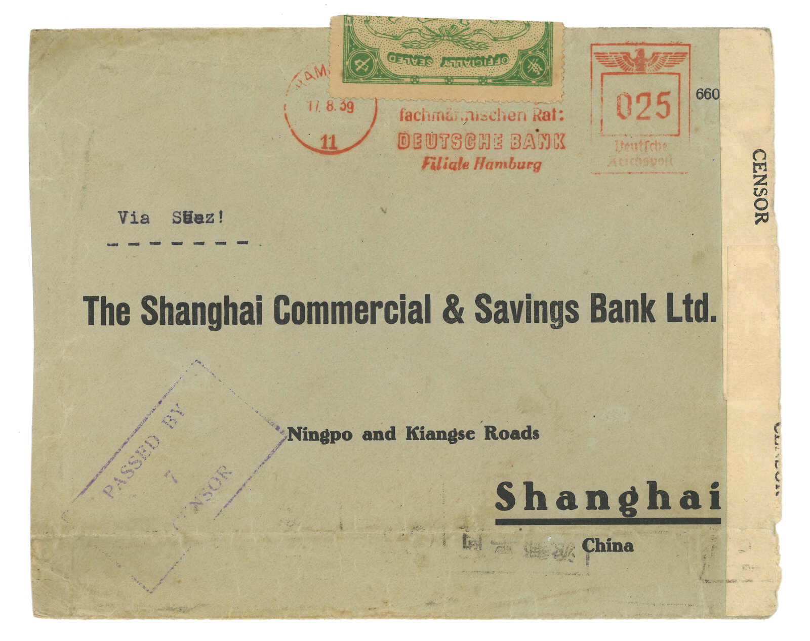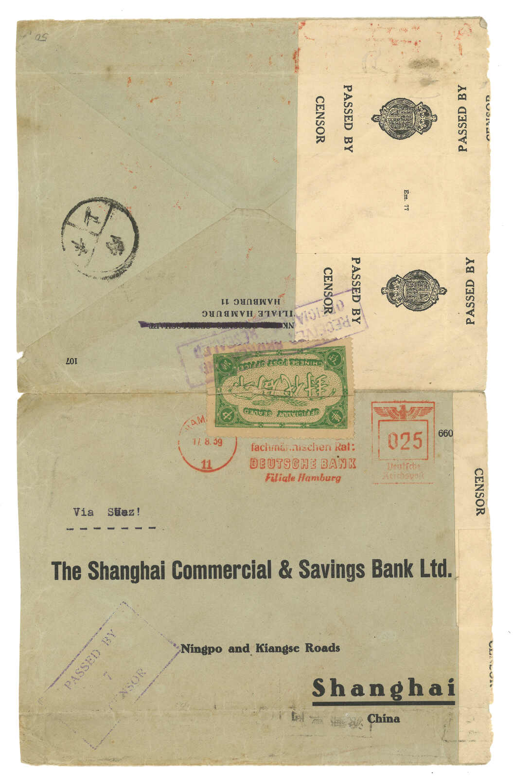 1939.8.17 德國寄上海匯豐銀行。二戰檢查封,鈐25芬尼機戳。檢查並重封,鈐放行指示戳。另貼民國第一版代封票,蓋有“RECEIVED BROKEN AND OFFICIALLY RESEALED”橫戳,旁鈐商碼戳。第一版代封票之甚晚例子。(Image 1) (Image 2) (Image 3)