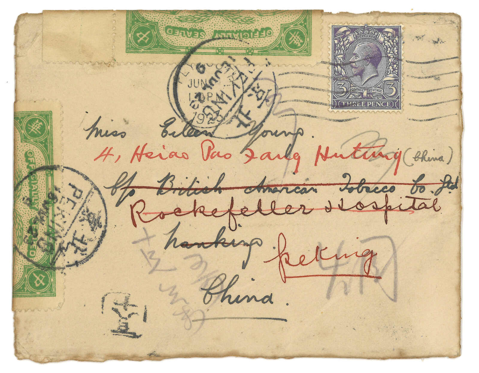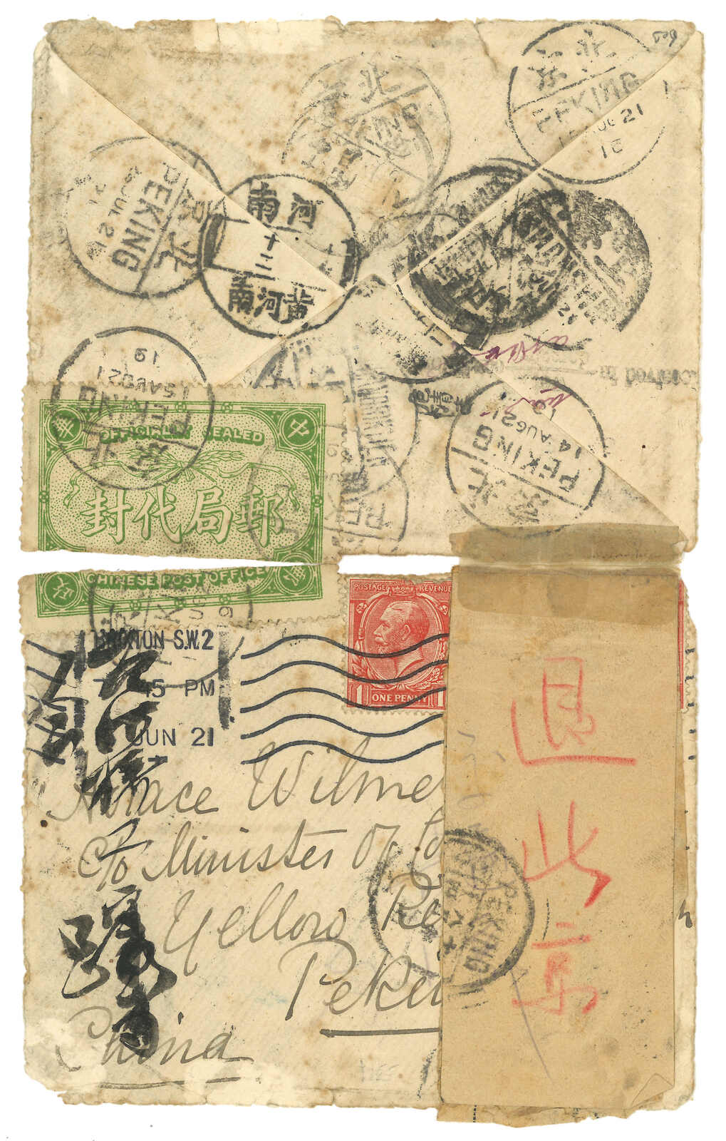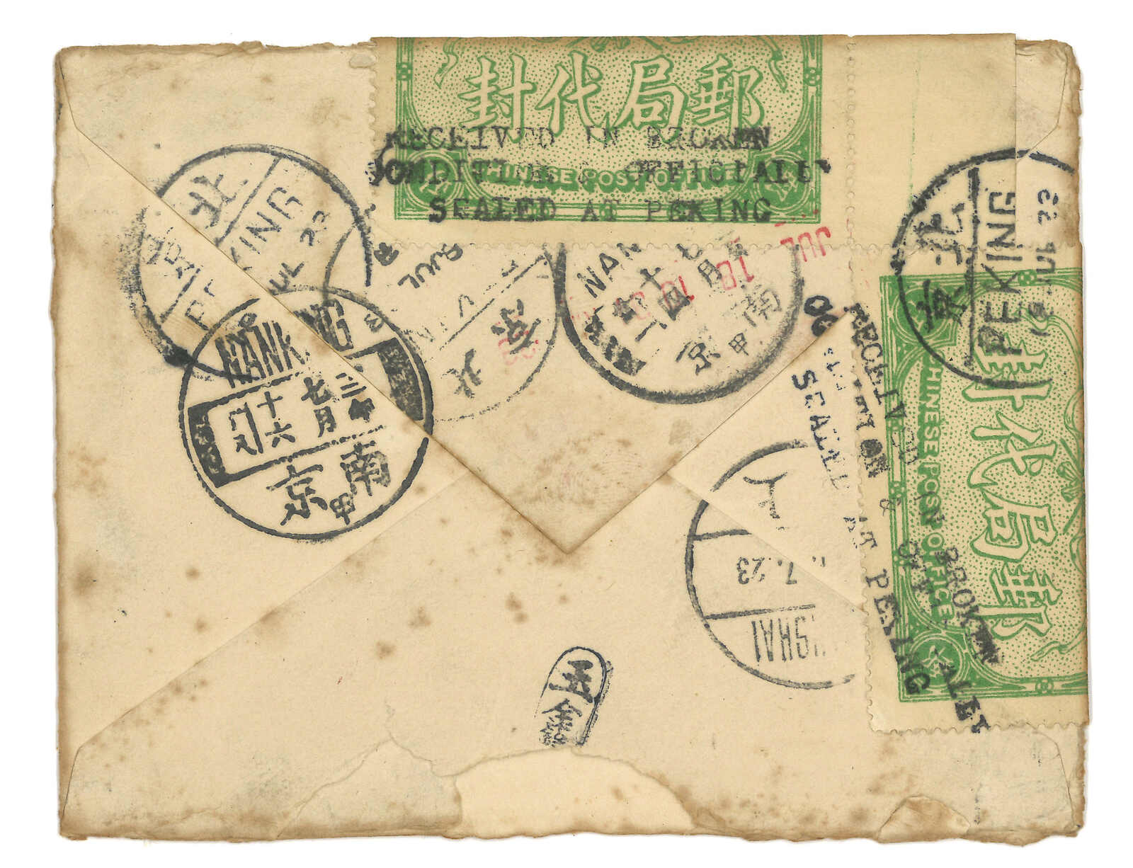 201 cover image1923 Britain (Jun) to Nanking, redirected to Peking, f.w. KGV 3d, tied by Plymouth wavy line d.s. Arrived Nanking (14 Jul) and redirected on 16 Jul to Peking (18 Jul). In combination with 1st print officially resealed label with "RECEIVED IN BROKEN CONDITION & OFFICIALLY SEALED AT PEKING" horizontal h.s.