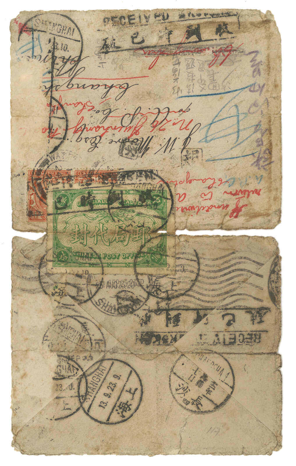 1923年英國寄長沙,改寄上海,貼1-1/2便士雙連。9.7抵長沙,改寄上海,9.13抵達。加貼第一版民國代封票,鈐“收到已破損”英漢橫戳。封右側應另有一枚代封票但掉落。(Image 1)