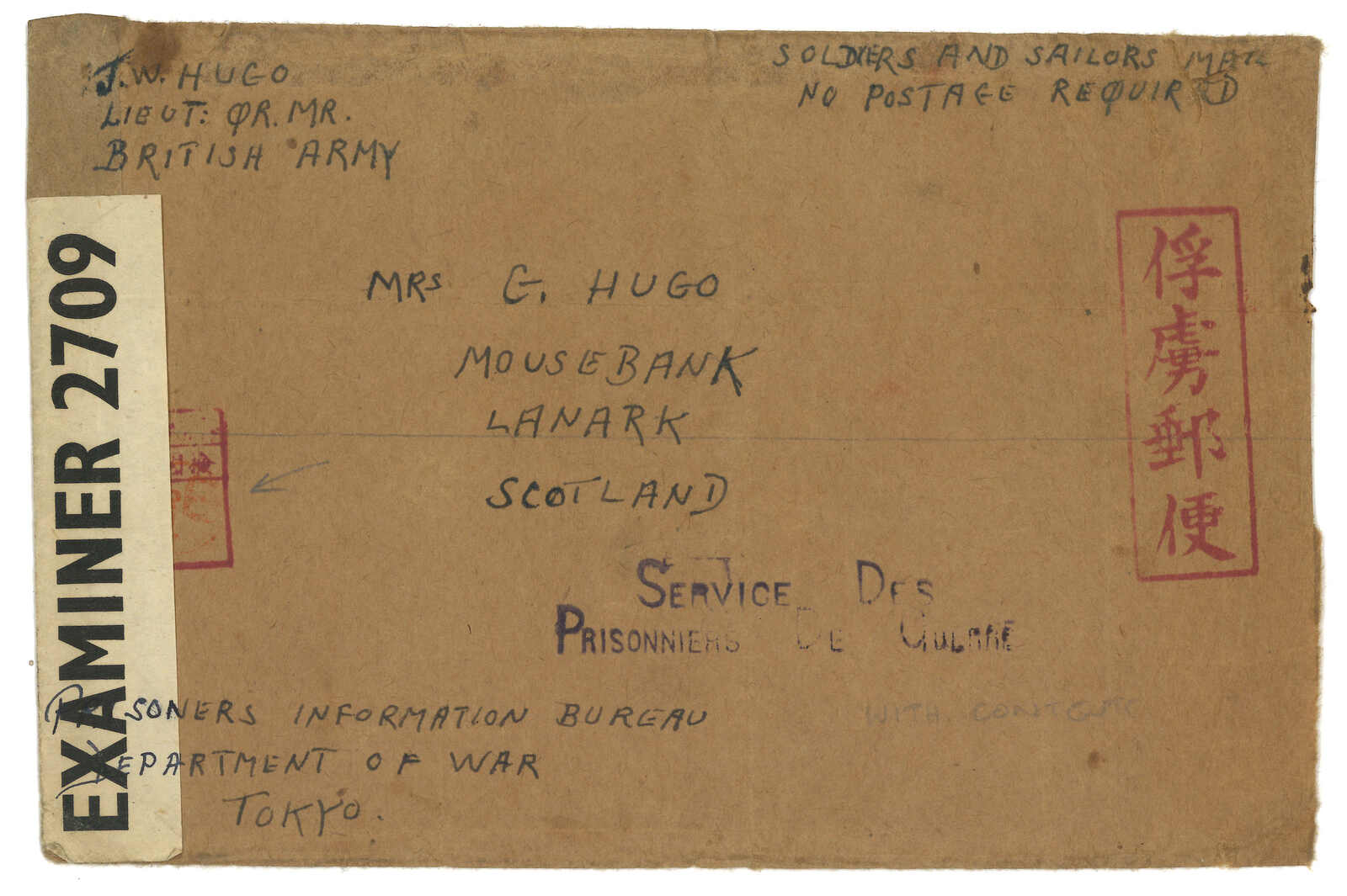 2102 image1940s WWII POW cover from British POW J W Hugo, Japan to Scotland, frankless, applied with Japanese cenosr mark and name seal of the censor.