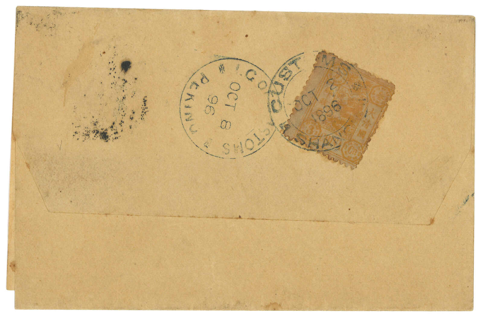 65 cover image1896 Postal wrapper (preprinted ½d) from P&O, London, tied by obliterator. Arrived Customs Shanghai (2 Oct) and f.w. Empress Dowager 3ca for doemstic rate. Arrived Customs Peking (8 Oct). Very scarce incoming wrapper f.w. Empress Dowager issues.