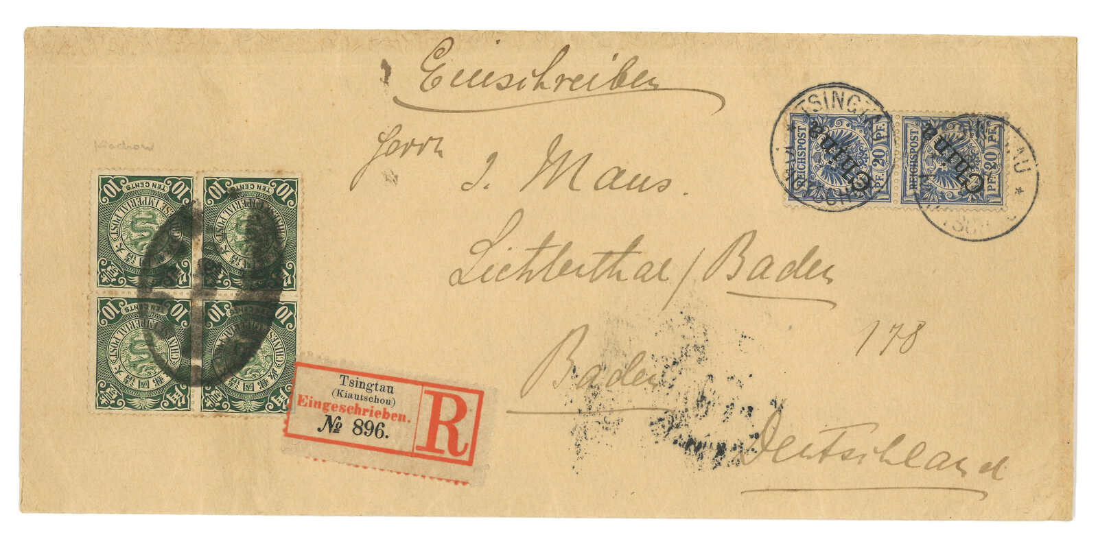 154 cover image1900 Kiaochow to J Maus, Germany. Registered cover, f.w. Coiling Dragon 10c in block of 4, tied by oval Kiaochow PO d.s. In combination with German Eagle stamp 20pf ovpt. China at sloping 48 degree in pair (Chan FG4), tied by Tsingtau German PO cds. Arrived Lichtenthal (26 May).