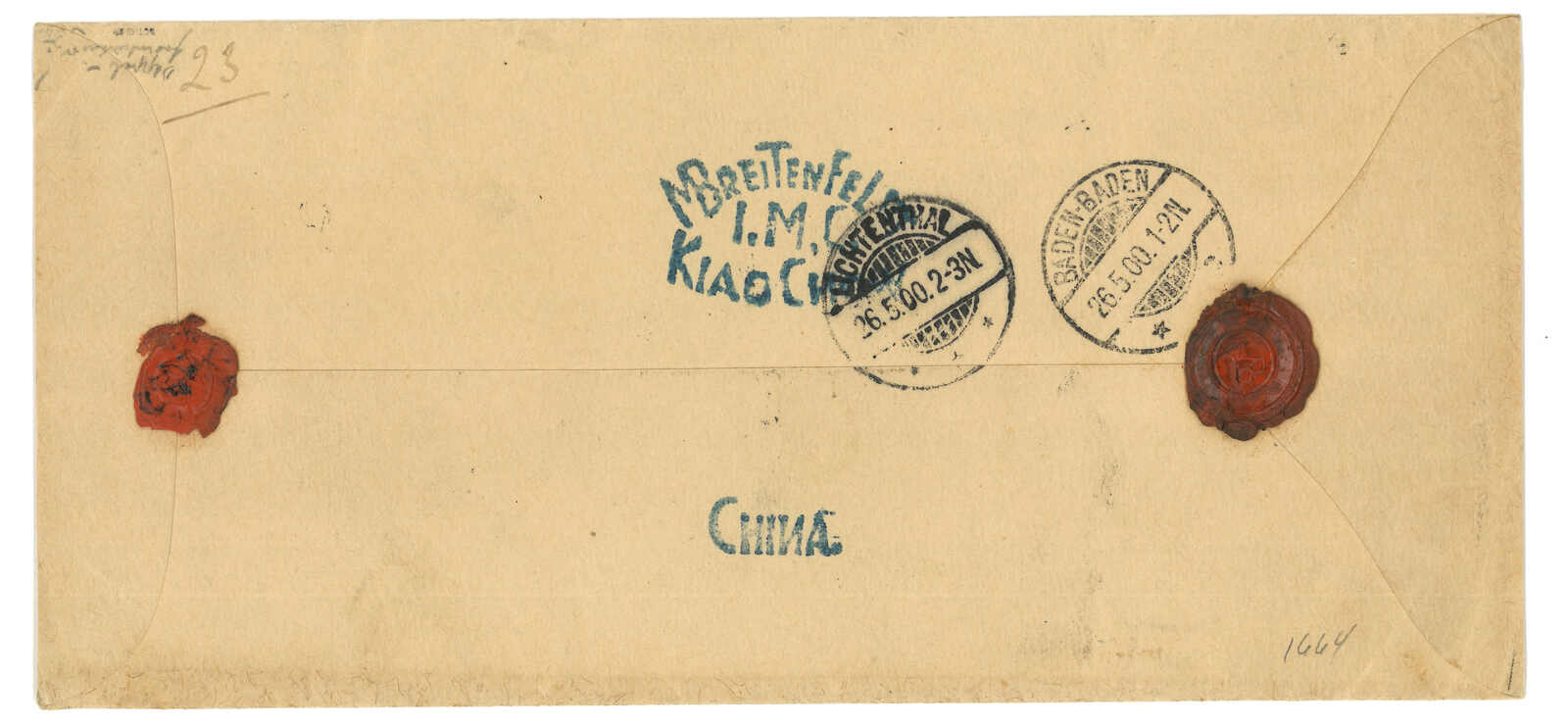 1900年膠州寄德國的茂斯。掛號封,貼蟠龍1角四方連,銷膠州郵政局橢圓形日戳。加貼德國鷹徽圖48度斜蓋China 20芬尼雙連(陳目FG4),銷青島德局日戳。5.26抵Lichtenthal。(Image 1) (Image 2)