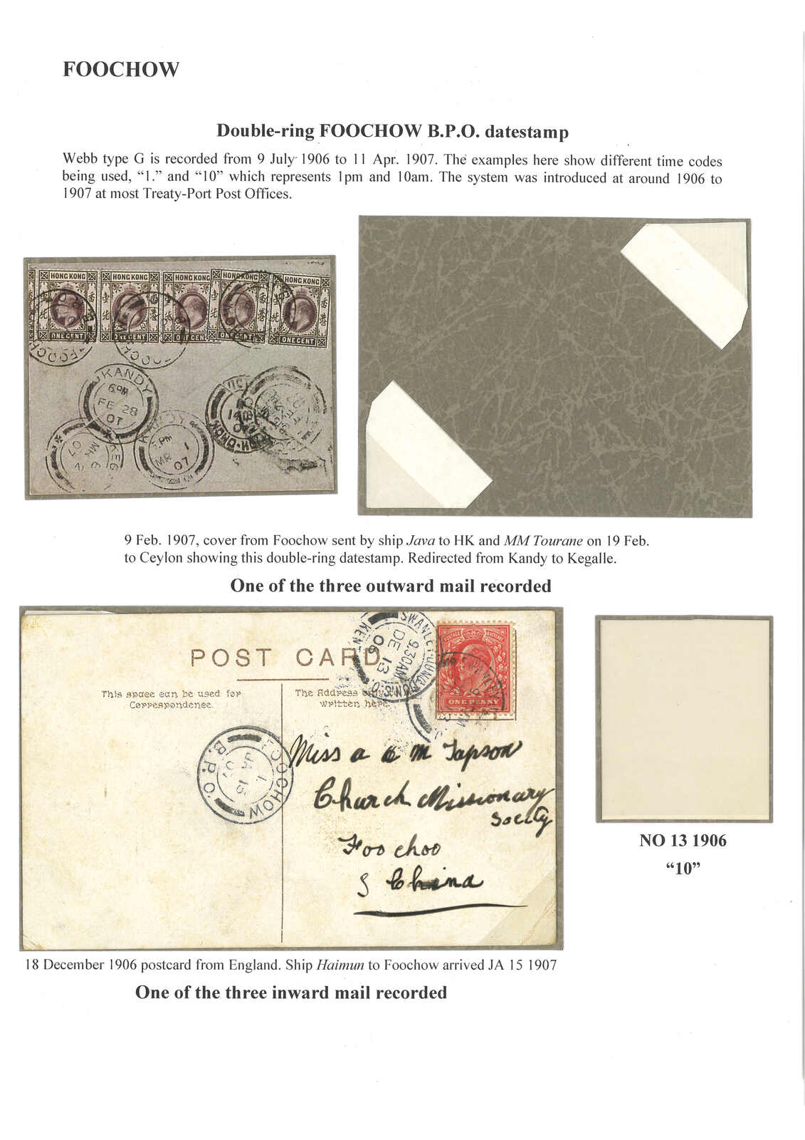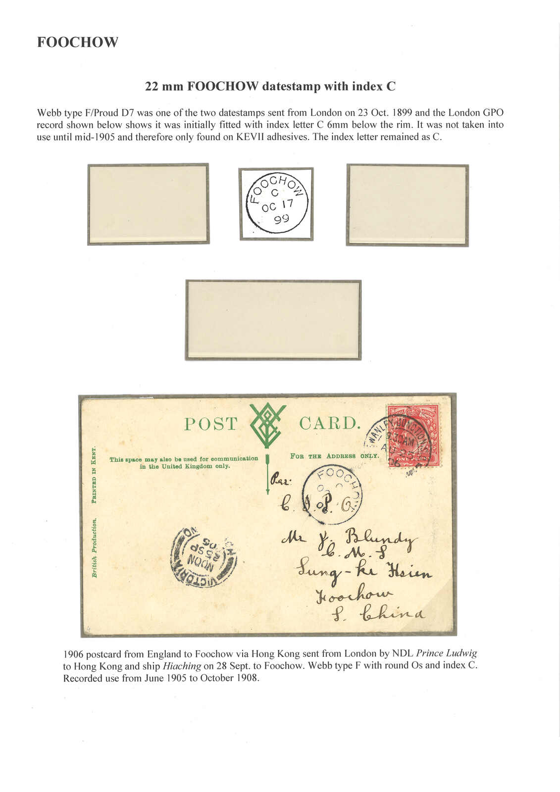 2289 cover image1906 England (18 Dec) to Foochow. Picture postcard, f.w. KEVII 1d. Arrived Foochow BPO (15 Jan) with scarce type G cds. It is the rarest Foochow BPO cancellation and its usage was short. One of the 3 incoming mails with this type of cds.