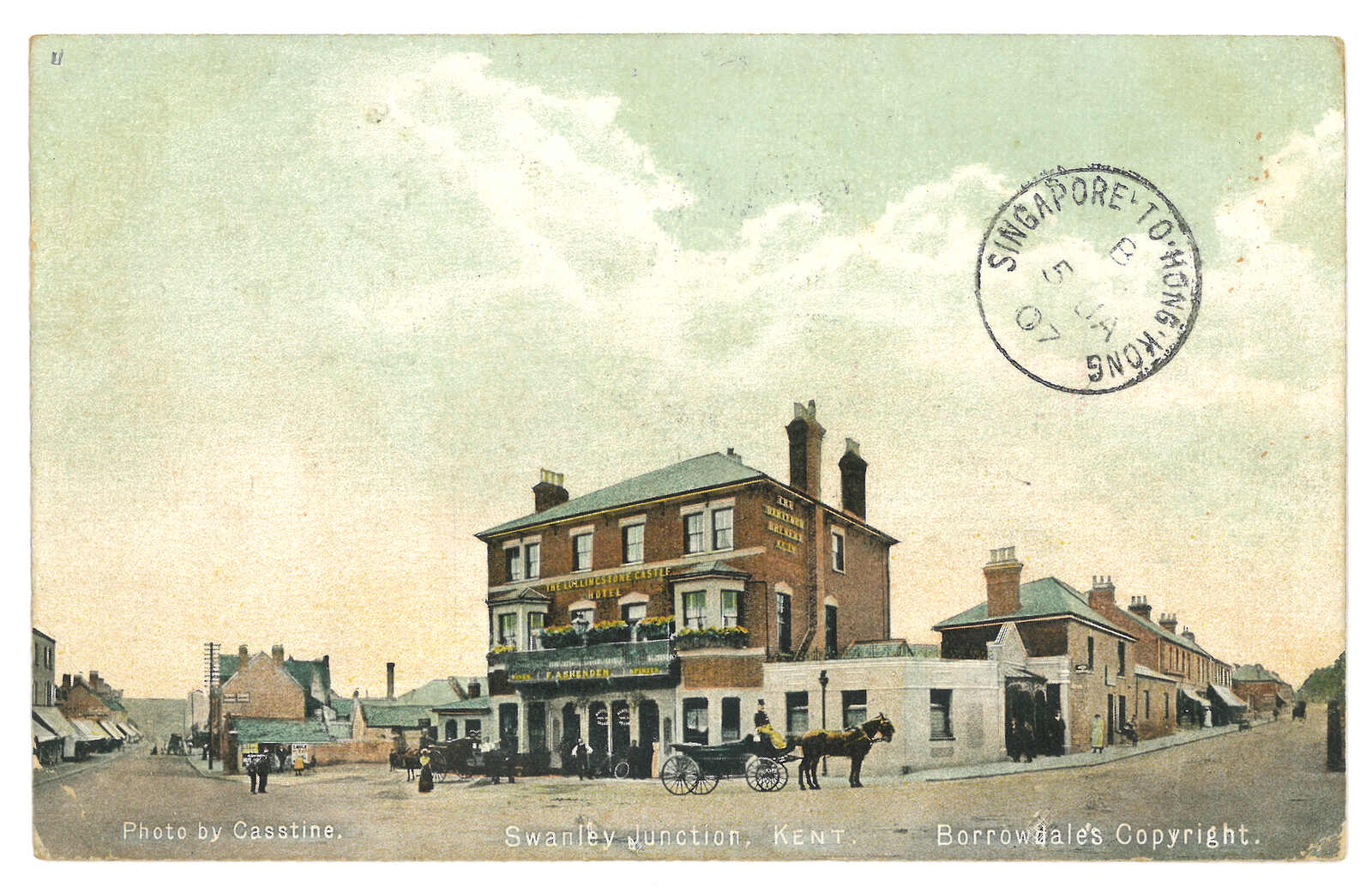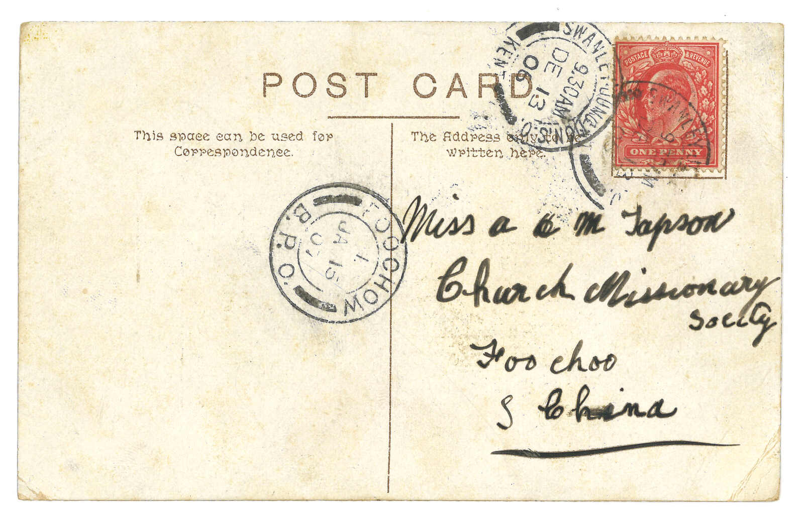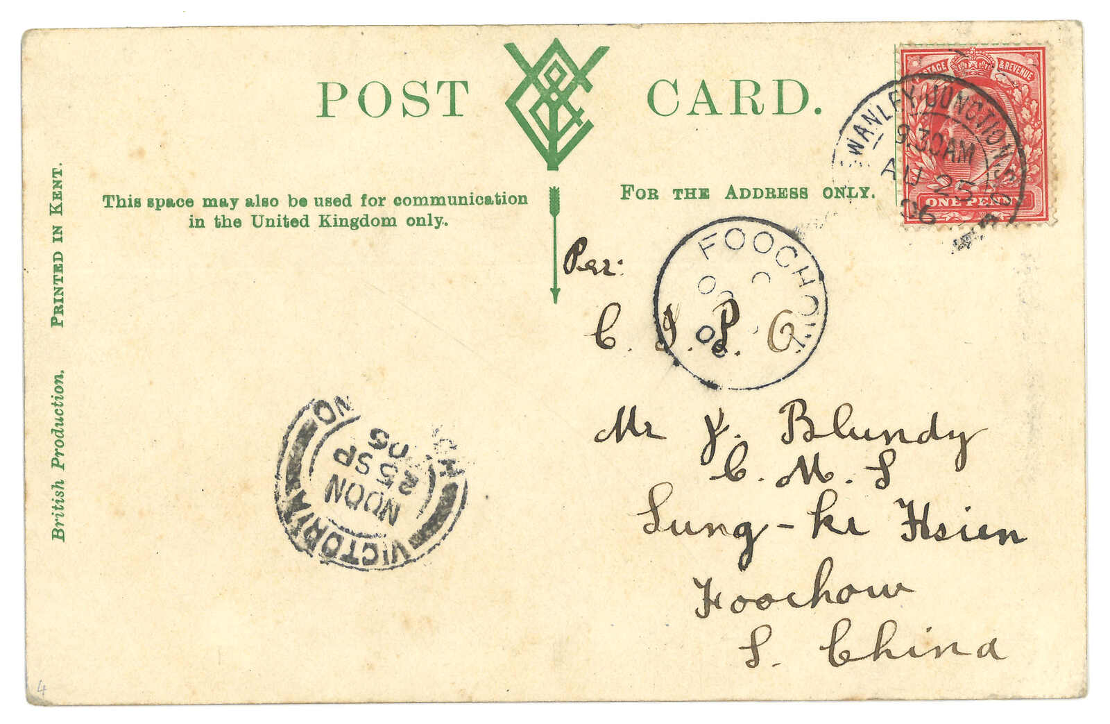 2287 cover image1906 England (25 Aug) to Foochow. Picture postcard, f.w. KEVII 1d. Transit Hong Kong (25 Sep). Arrived Foochow BPO (Oct) with Webb type F (index C) arrival cds.