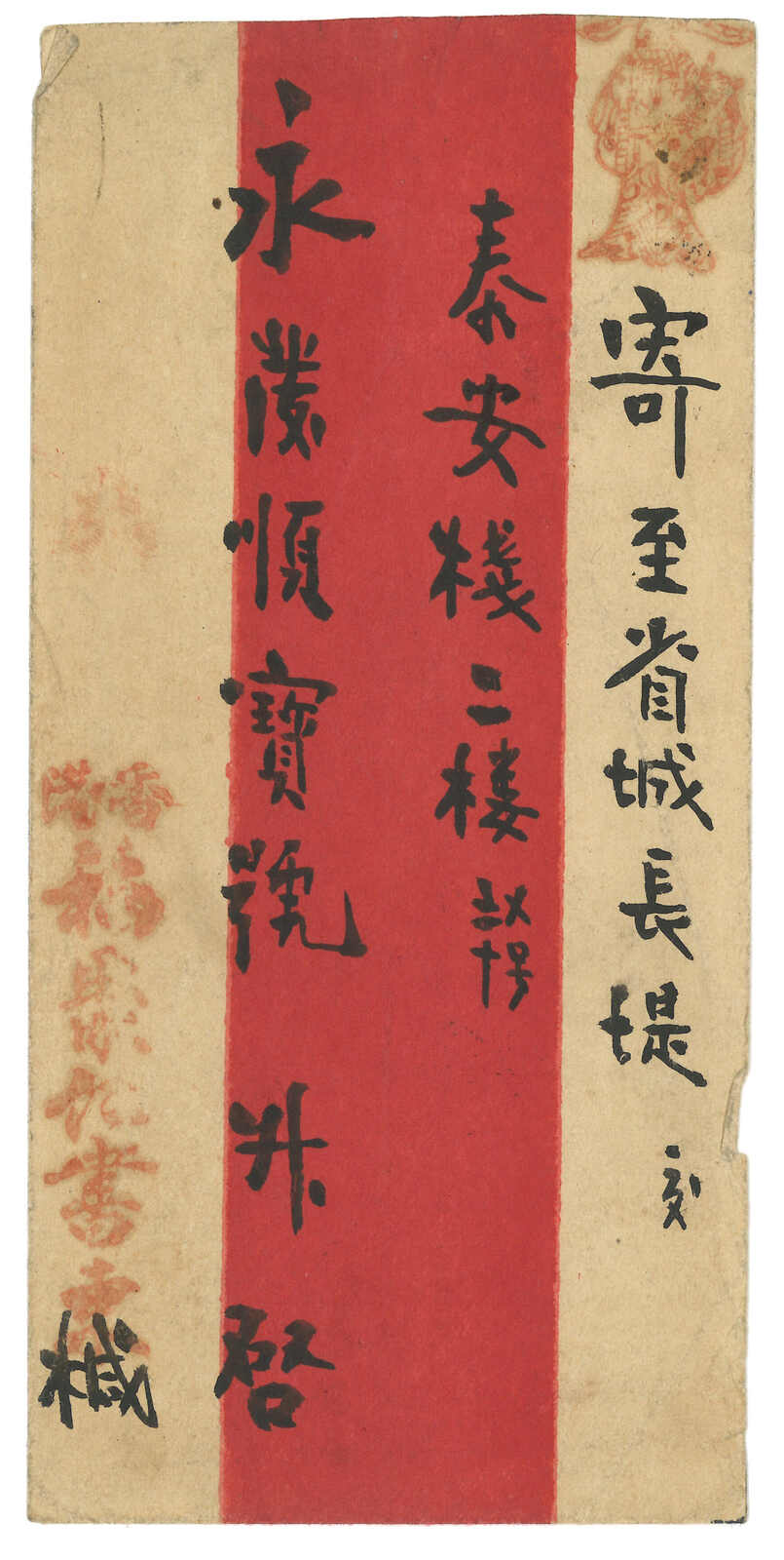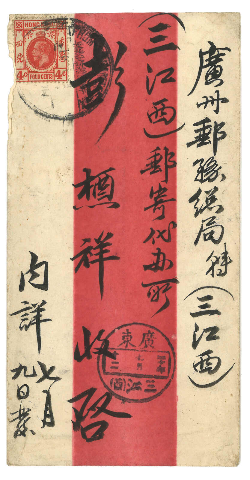 1934 image1931 (Jul) Red band cover posted at steamer mail box to Sankiang, f.w. Hong Kong KGV 4c, tied by “From Steamer Box” double-ringed cds. Arrived Sankiang (12 Jul). On reverse with oval Sankiangsi Min Chu seal. With original letter.