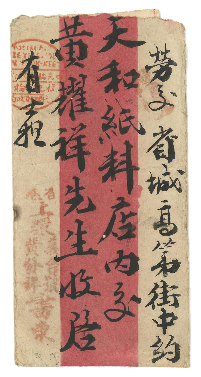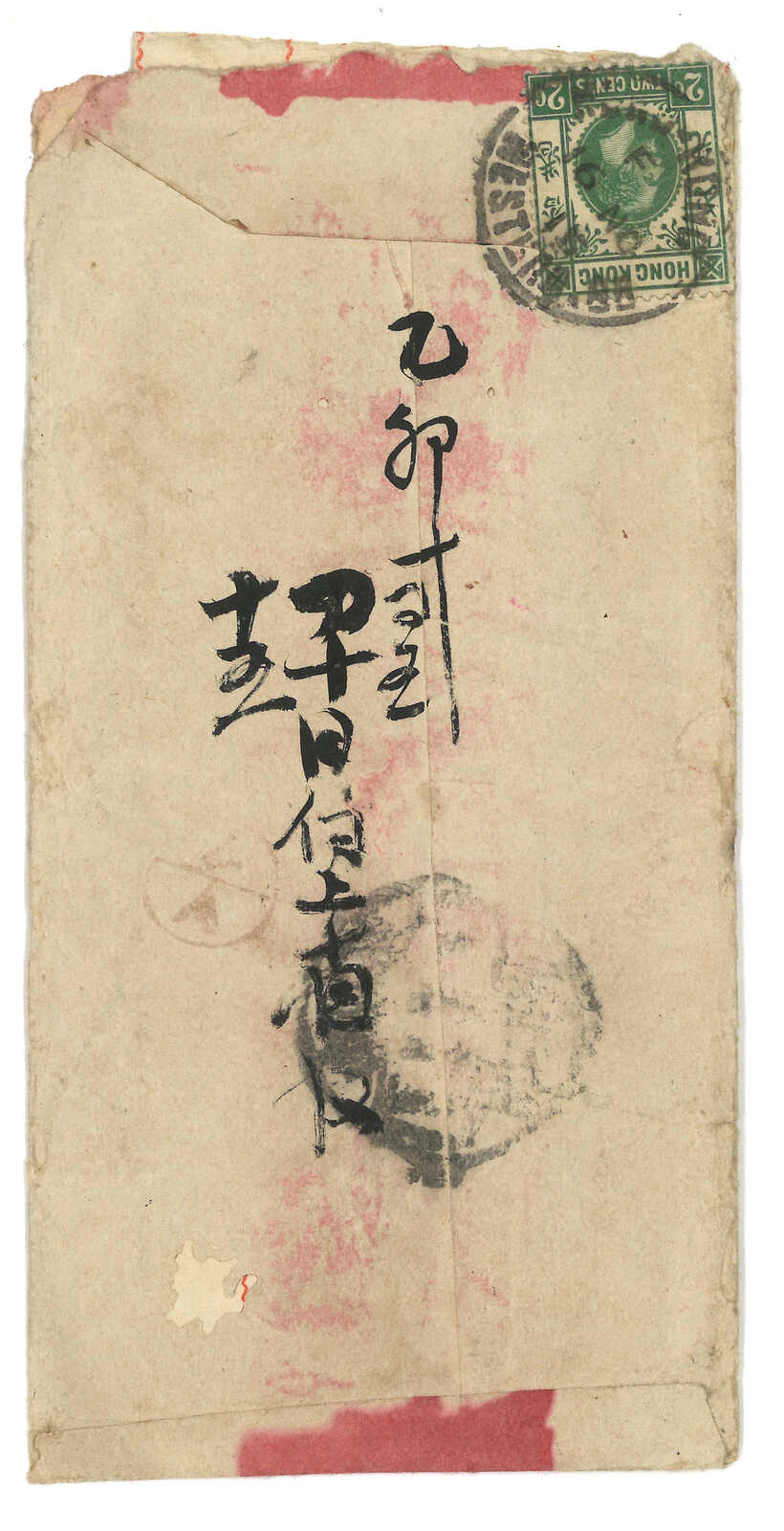 1932 image1915 Hong Kong (16 Nov) to Canton. Red band cover, f.w. Hong Kong KGV 2c on reverse, tied by Western Branch Webb type D cds. On front with Fook-Kee postal agent circular seal. With original letter. Cover opened at top. With insect hole.
