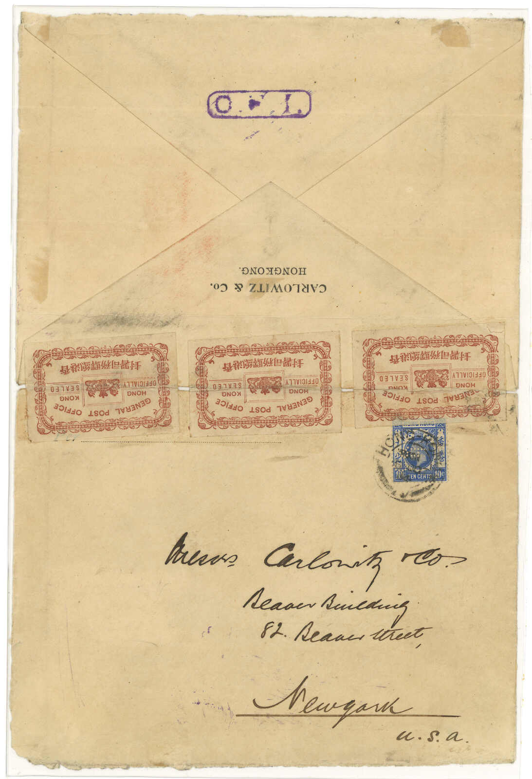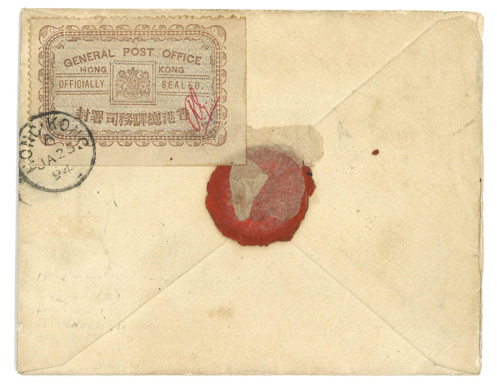1894.1.25 香港寄火奴魯魯郵政總長,貼香港維多利亞女皇像10仙x2,銷香港A 字日戳。背貼香港總驛務司署封封條,同樣鈐香港日戳。此為唯一一件因保安原因,而非修補破損郵件而貼用封條之存世例子,亦是該封條本來之用途。Eric Etkin舊藏。2016年Hong Kong Study Circle Wilde Cup之得獎發現。Oresetti's monograph第2頁原件。亦為香港最早之貼用封條例子。(Image 1) (Image 2)