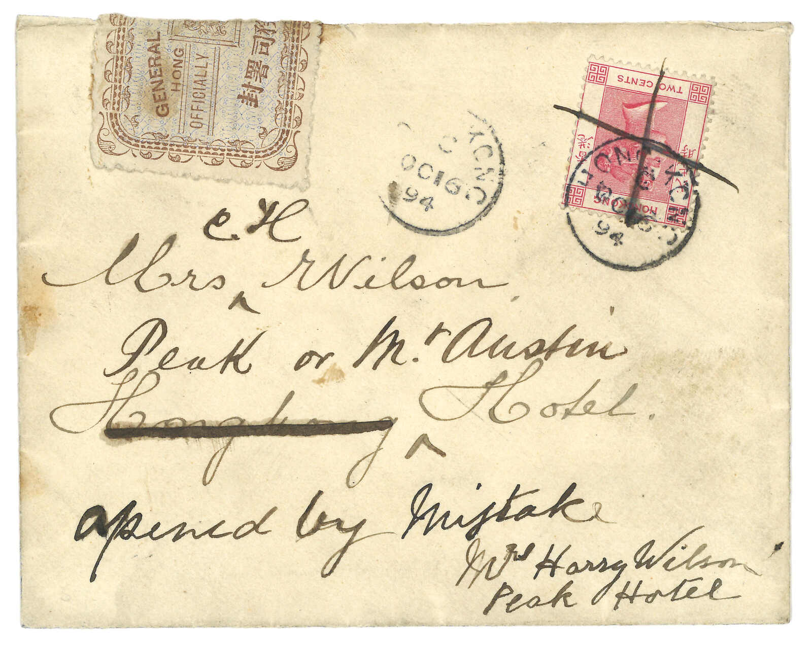 1894.10.16 香港本埠,貼香港維多利亞女皇像2仙,銷香港C字日戳並以筆劃銷。背貼香港總驛務司署封封條,正面注明“opened by mistake”。香港貼用封條以修補信封之最早例子。Oresetti's monograph第3頁原件。(Image 1) (Image 2)