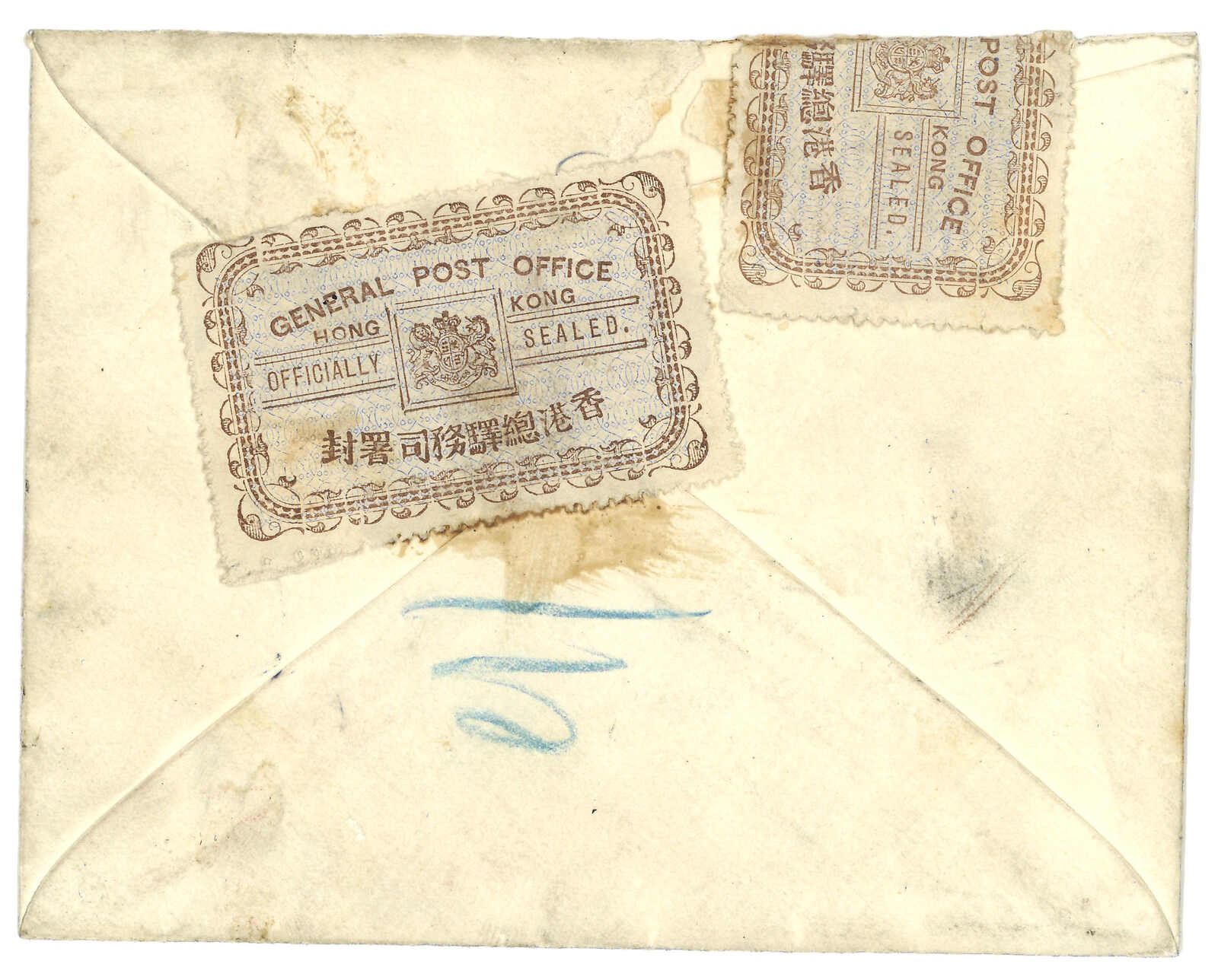 264 cover image1894 Hong Kong (25 Jan) to Postmaster General Honolulu, Sandwich Islands, f.w. Hong Kong QV 2x 10c, tied by Hong Kong index A cds, alongside with "p Oceanic" annotation. On reverse with "Officially Sealed" label (type 1) on reverse for security reason and tied by cds. It is the only recorded usage of the label for their original purpose to seal a cover for security reason (as opposed to the subsequent usage to reseal damaged envelopes). Ex- Eric Etkin. Winner of the 2016 Hong Kong Study Circule Wilde Cup for the best new discovery. Illustrated on P.2 of Mr. Oresetti's monograph. It is also the earliest recorded usage of Hong Kong officially sealed label.