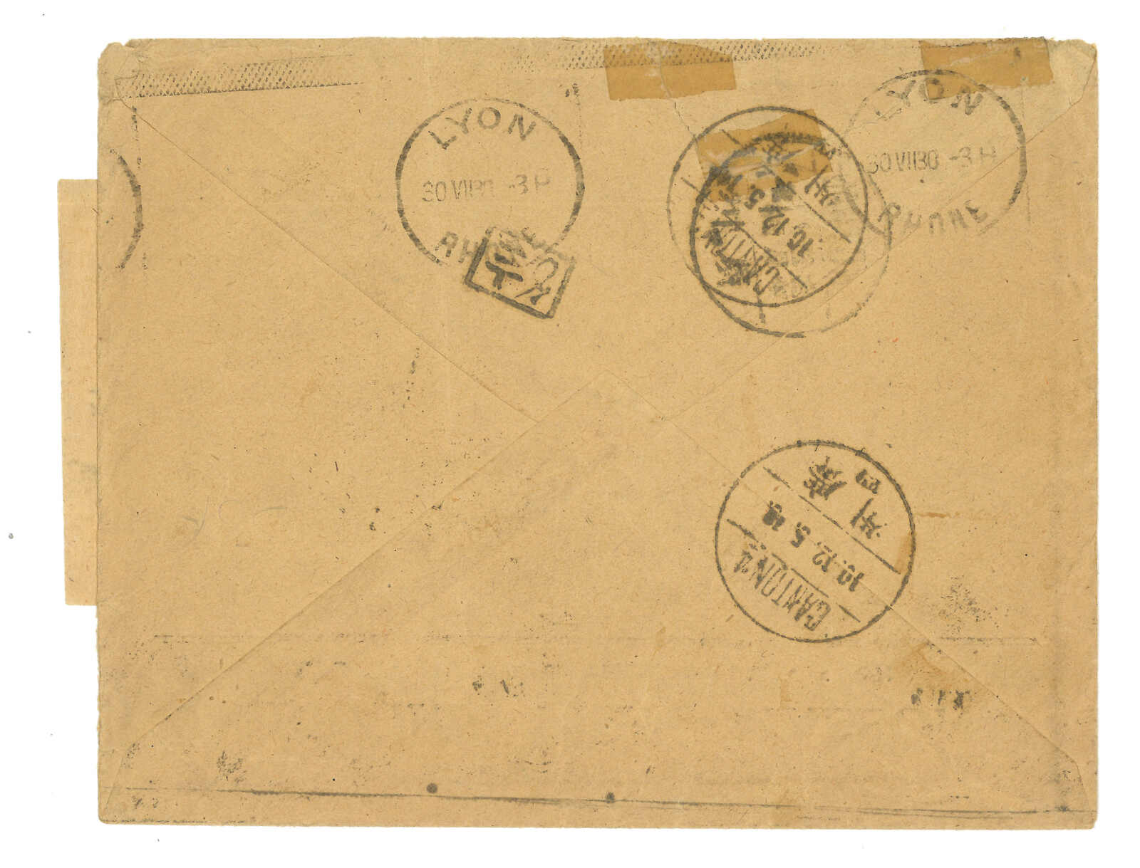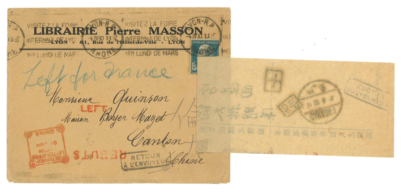 1930.4.4 法國里昂寄往廣州,5.12到達後,注 明“收信人已囘法國”,郵局加上退信條,蓋 上離開和退回戳記, 和少見的“廣州退信局“ 方戳(6.16[日期倒置]),7.20回到里昂。難 得的兩次世界大戰之間的退信,手續齊全!(Image 1) (Image 2) (Image 3)
