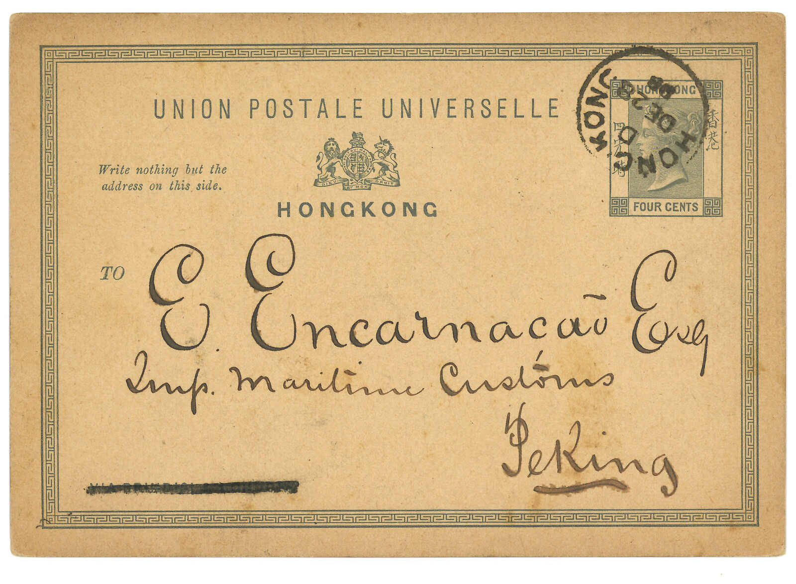 1898.12.28 香港寄北京海關E.E.Encarnacao。香港維多利亞女皇像4仙郵資片,銷香港日戳。1.3經上海,鈐大圓戳。(Image 1) (Image 2)