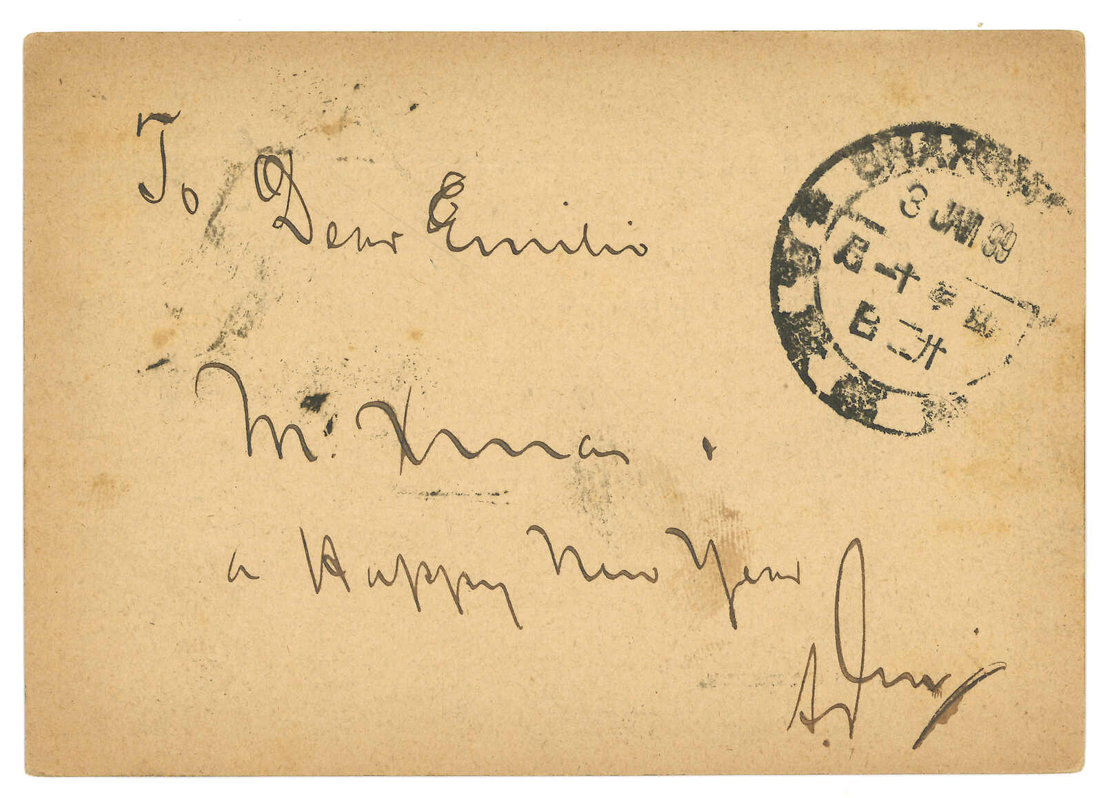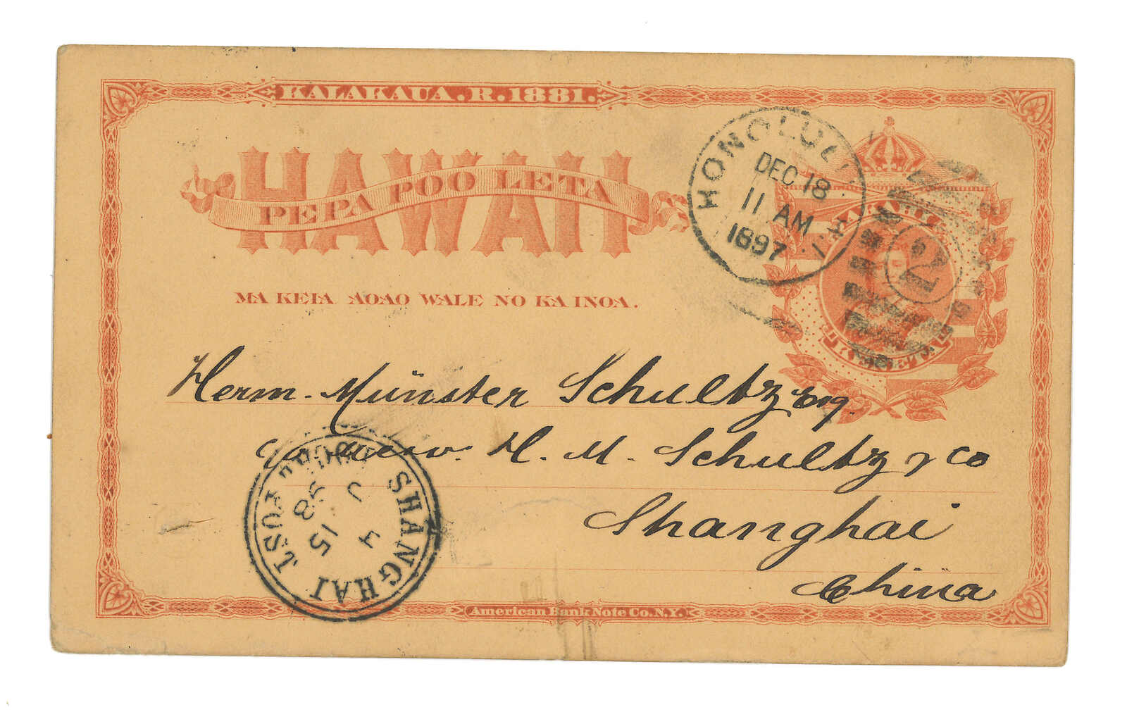 127 cover image1897 (18 Dec) Hawaii stationer card to Shanghai, tied by Honolulu duplux d.s. Arrived Shanghai LPO (15 Jan).