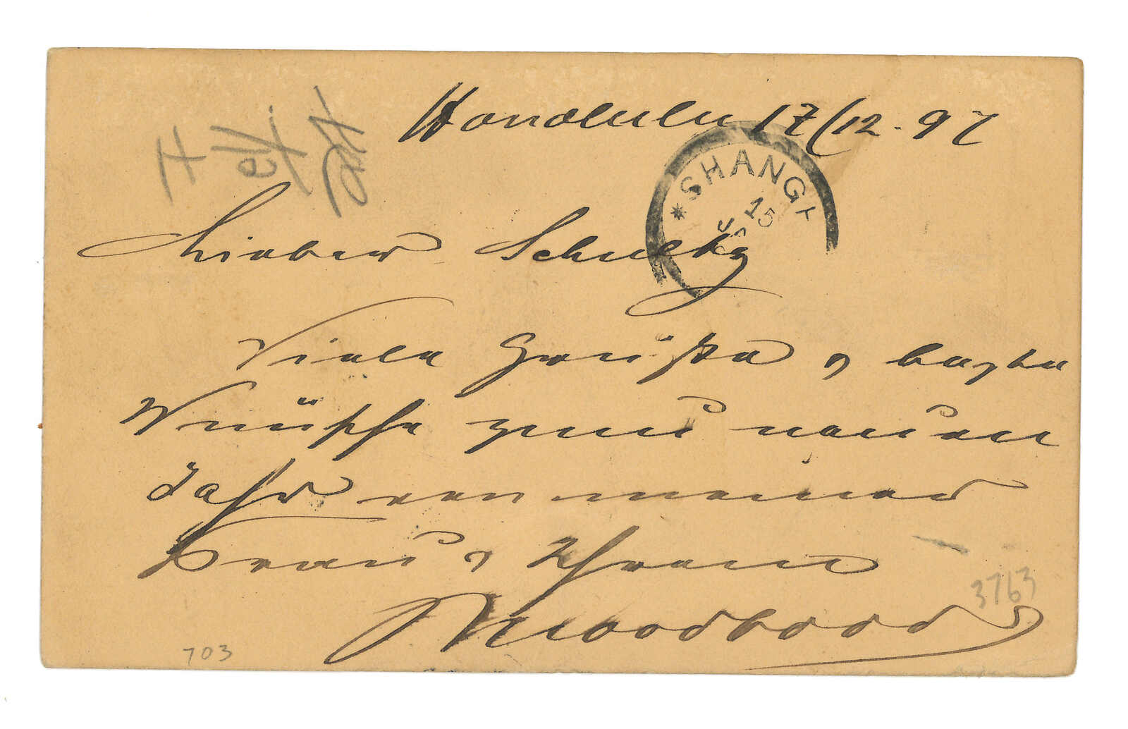 1897.12.18 夏威夷郵資片寄上海,銷火奴魯魯雙聯日戳。1.15抵上海工部郵局。(Image 1) (Image 2)