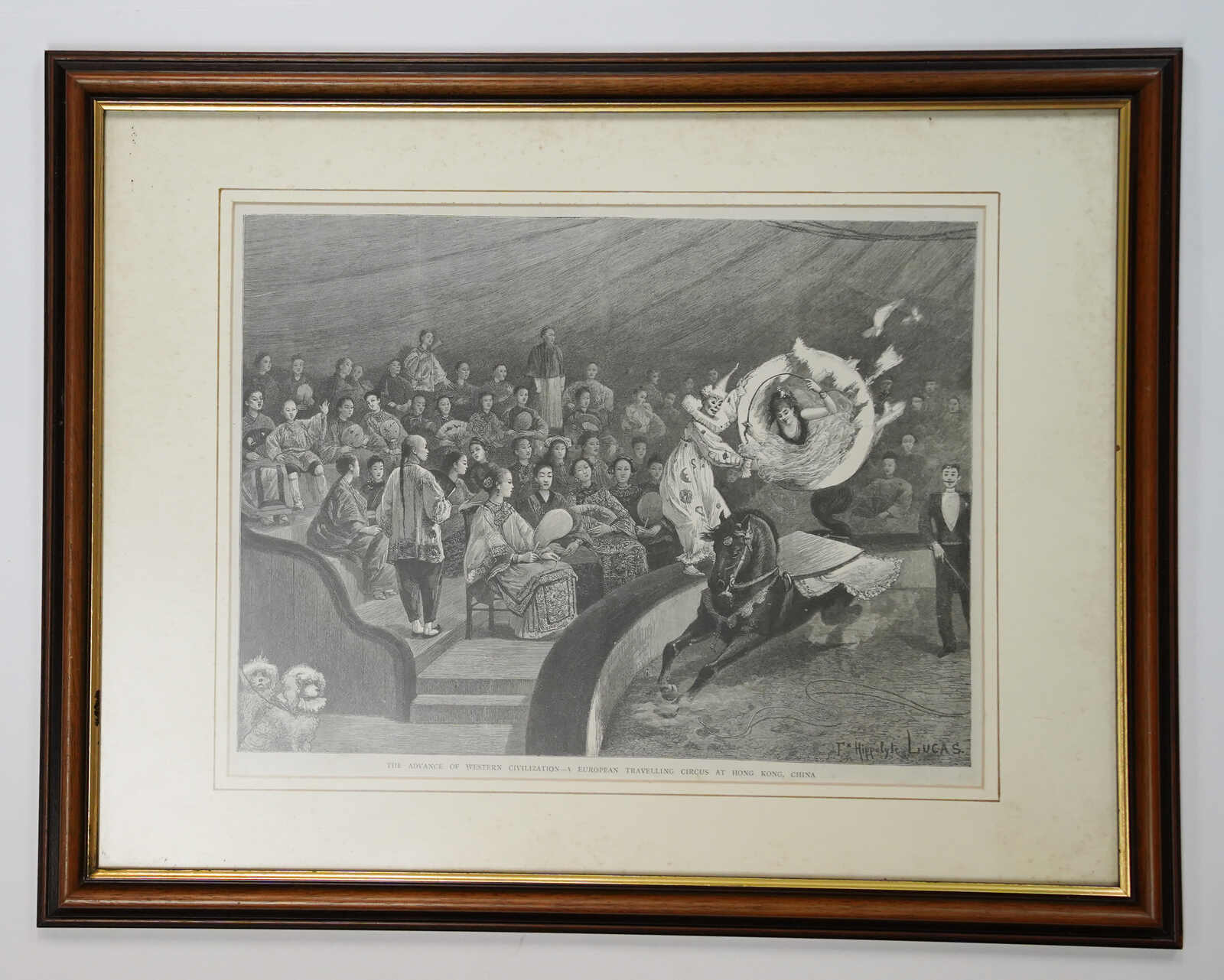 十九世紀“西方先進文明 - 中國香港的一支巡迴馬戲團”版畫,已裝裱。由S Bradshaw雕刻。極具歷史意義。40 x 46厘米。(Image 1)