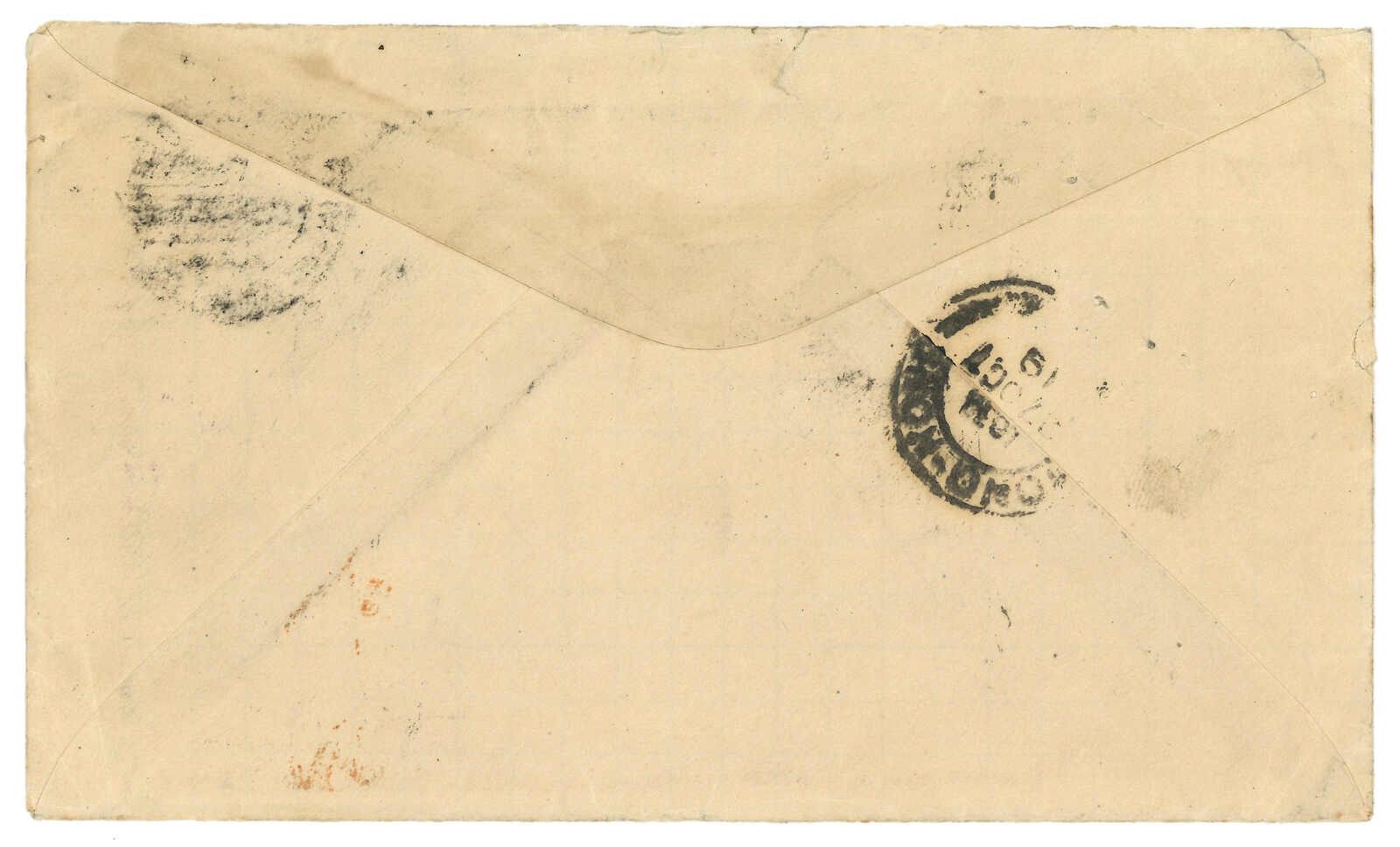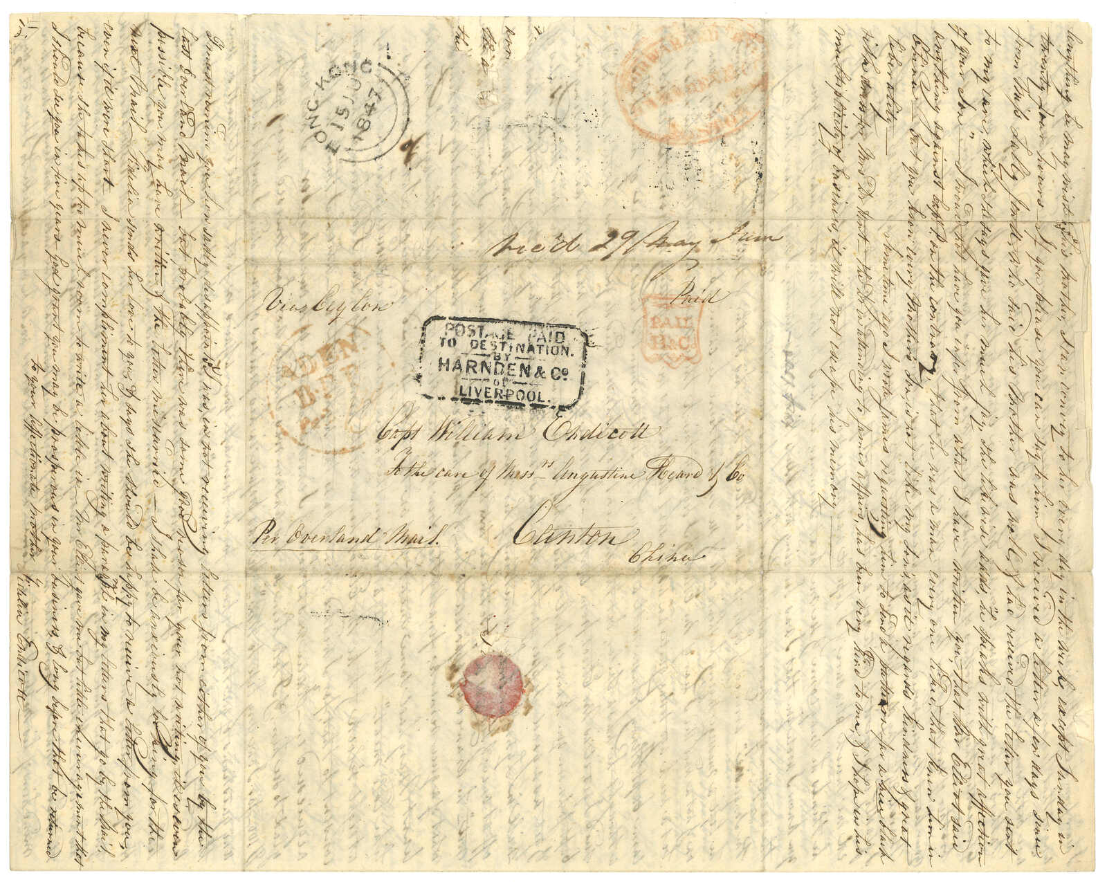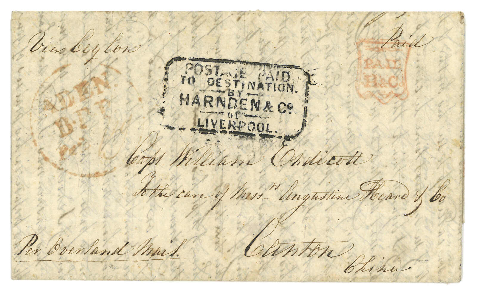 1842 cover image1847 (Mar 21), a letter sent from the USA to Canton, with a very fine frame of “POSTAGE PAID TO DESTINATION BY HARNDEN & Co. of LIVERPOOL” in black, sender’s directive “Overland mail” and “via Ceylon”, red “PAID/H & Co.” in flag shape, arriving Liverpool, then via Alexandria, Suez, Aden and Hong Kong, large red “ADEN B.P.P. Paid (officer signature)” in circle handstamp. On the reverse, a red oval forwarder mark “FORWARDED BY / HARNDEN & CO. BOSTON”, Hong Kong backstamp (15 June 1847), very fine, very scarce Harnden cover to China, the Aden marking is rare on Harnden covers. A very fine and rare forwarder mail from the USA to China with twice forwarded letter to Canton.(Image 1) (Image 2) (Image 3) (Image 4) (Image 5) (Image 6)