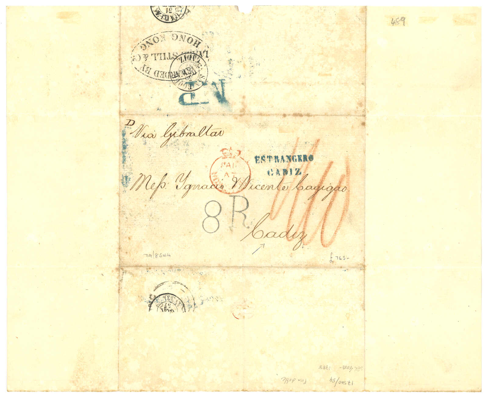1870 cover image1857 (AU 24) an entire wrapper full of characters addressed to Mess. Ygnacio & Nicente Cagigao CADIZ. On the obverse, cancelled by a very fine small crown “PAID AT HONG-KONG” (Webb type 9), Spanish local postage mark “8 R”, a Spanish handstamp “ESTRANGERO CADIZ” in blue color, and a manuscript rate in red crayon “1/10”. On the reverse, cancelled by a double-arc datestamp “HONG KONG / 24 AU / 57”, an oval forwarder mark “FORWARDED BY / LYALL STILL & Co / HONG KONG” and a local handstamp in blue green “MP”. A highly good quality entire for the use of small crown HONG-KONG PAID. In very good conditions.(Image 1) (Image 2) (Image 3)